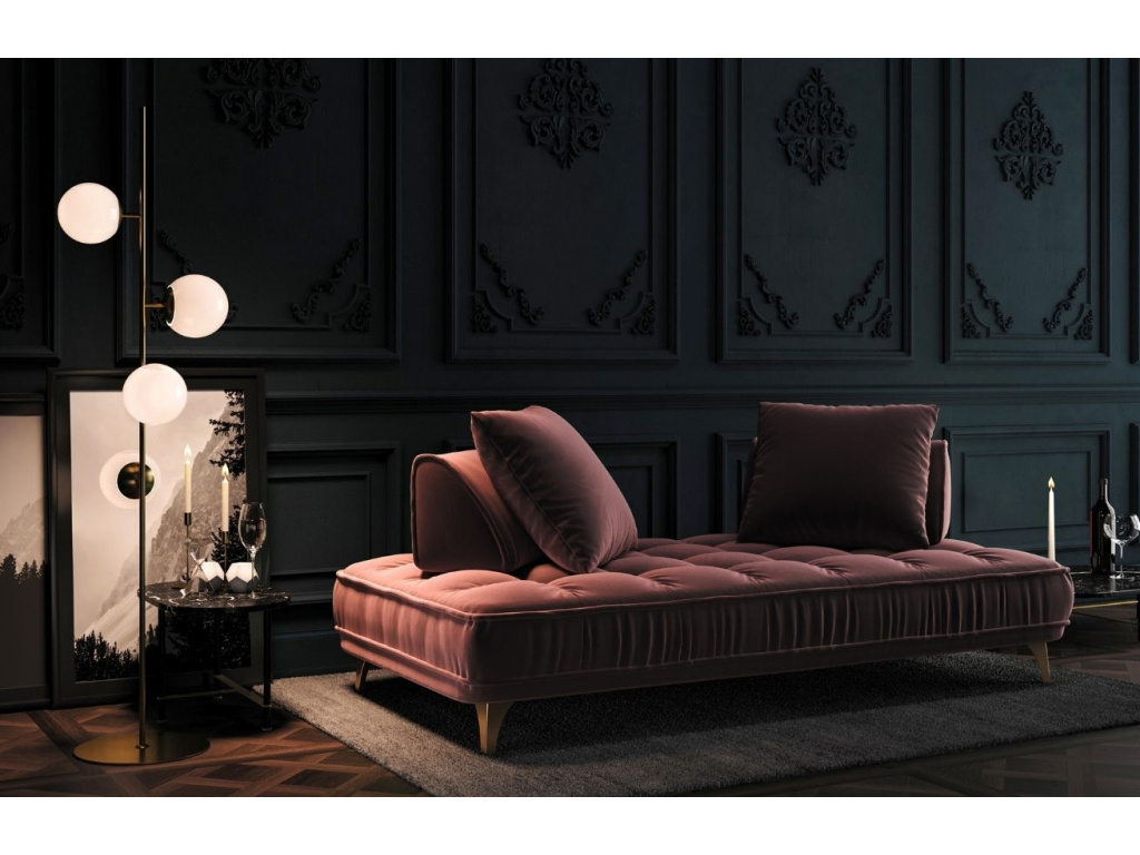 Stylová a luxusní designová pohovka DEVICHY Chloe se díky svému jedinečnému a minimalistickému tvaru stane nepřehlédnutelnou součástí vaší domácnosti. Stabilní kovová podnož ve zlaté barvě je dokonale doplněna o čalounění z kvalitní sametové tkaniny ve starorůžové barvě provedení, která je charakteristická pro svou nadprůměrnou odolnost a speciální vodě odpudivou úpravu. Po odebrání dekorativních i opěrných polštářů lze z pohovky udělat lůžko, a tak se i vaše návštěva pohodlně a stylově vyspí.