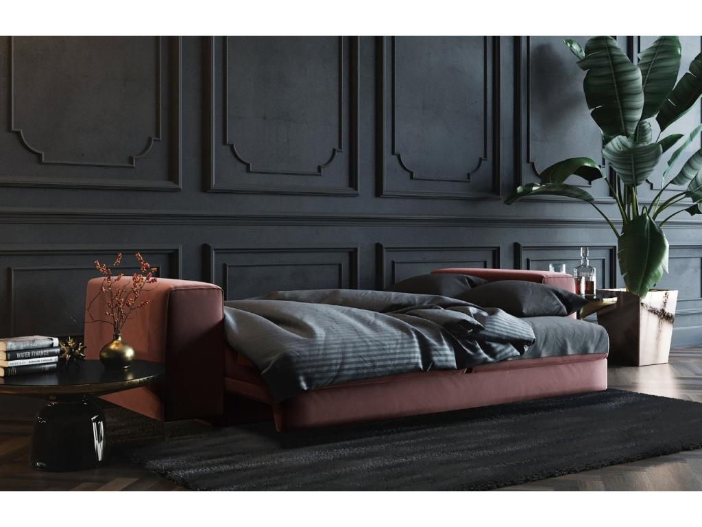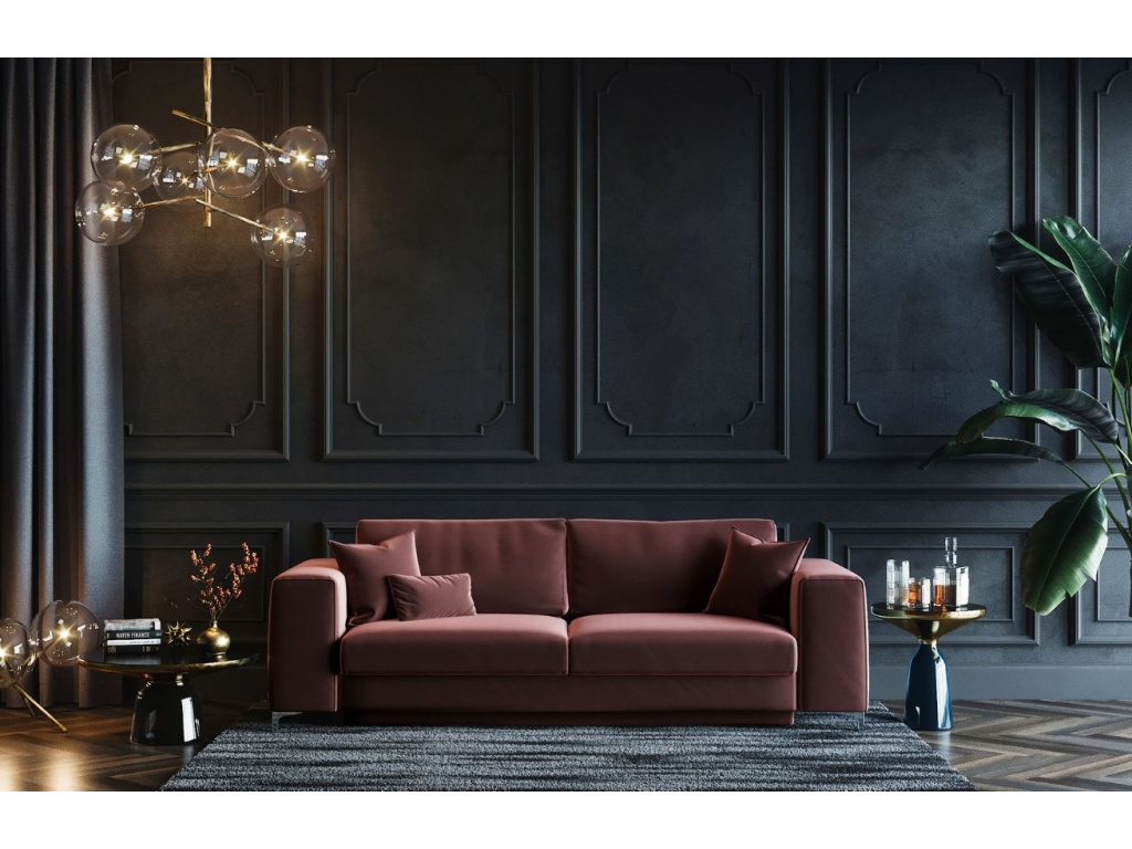 Moderní třímístná pohovka DEVICHY Rothe s jednoduchou konstrukcí uspokojí potřeby i toho nejnáročnějšího zákazníka. Pohovku lze snadným rozložením přeměnit na pohodlné a dostatečně velké lůžko. Její čalounění si na první dotyk zamilujete - je tvořeno kvalitní sametovou tkaninou v růžovém provedení, která je charakteristická svou nadprůměrnou odolností a speciální vodoodpudivou úpravou. Reprezentativní a exkluzivní vzhled pohovky v sobě dokonale kombinuje pohodlí a styl.