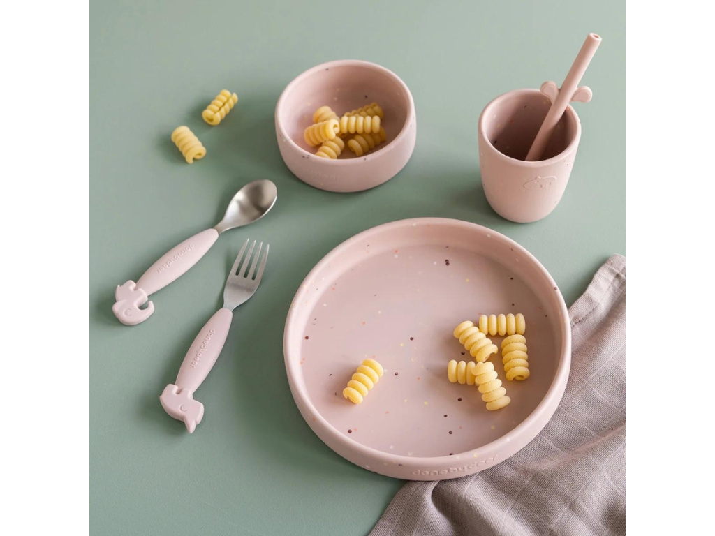 Jídelní sada Confetti pomůže všem malým jedlíkům samostatně jíst své pokrmy. Silikonový povrch zajistí, že nádobí nebude sklouzávat ze stolu. Kelímek je tvarovaný tak akorát do malé dětské ručičky, a zaoblené vnitřní hrany misky a talíře usnadní nabírání jídla. Sada je v něžném růžovém designu s drobnými konfety. Další produkty a jídelní sady pro děti můžete najít pod značkou Done by Deer.