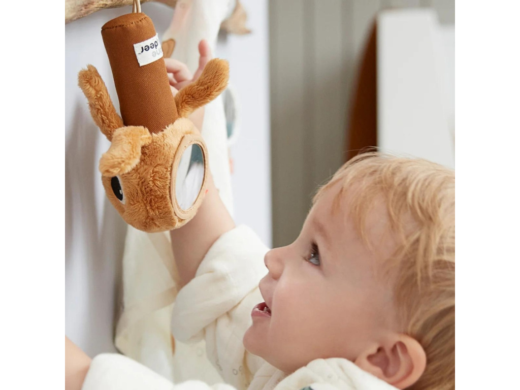 Látkové chrastítko se zrcátkem Jelly od Done by Deer je plné stimulujících funkcí, které jsou ideální pro malé zvídavé průzkumníky. Snadno uchopitelná měkká rukojeť po zmáčknutí vydá vrzavý zvuk, v zrcátku zas může drobeček prozkoumat svoji tvářičku. Chrastítko má také praktické poutko k zavěšení na postýlku, kočárek či hrazdičku.