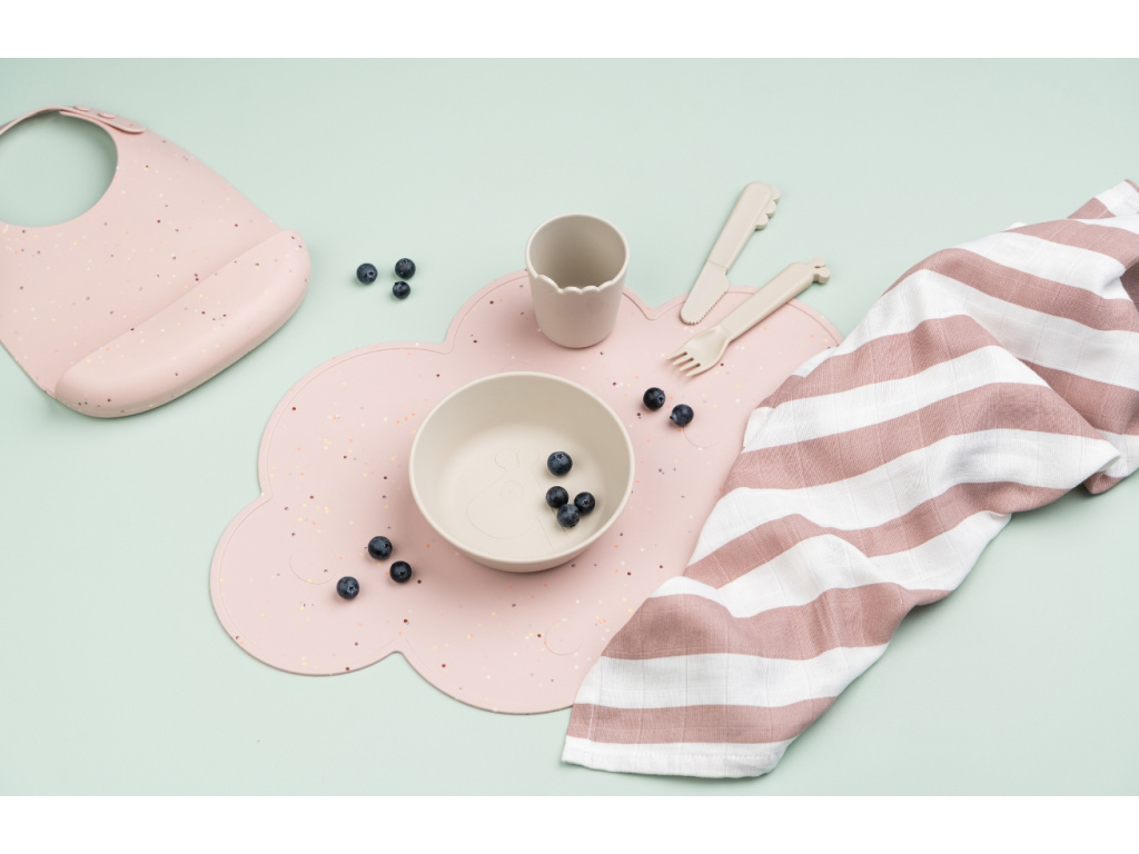Růžové silikonové prostírání Confetti ve tvaru mráčku je vyrobené z protiskluzového silikonu. Díky použitému materiálu nemusíte mít obavy, že z něj nádobí sklouzne. Prostírání ochrání desku stolu před znečištěním a jeho velkou výhodou je možnost nechat ho umýt v myčce na nádobí. Také má lehce zvýšený okraj, který zachytí tekutinu v případě vylití. Díky jeho úsporné velikosti ho srolujete s sebou i na rodinný oběd nebo dětskou oslavu.