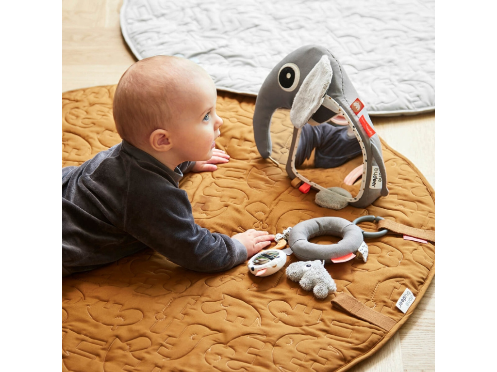 Interaktivní kroužek od značky Done by Deer bude zábavným doplňkem do postýlky každého děťátka. Na kroužku jsou zavěšené různé prvky se zábavnými aktivitami, se kterými můžou dětičky procvičovat jejich hmatové, zrakové a sluchové smysly. V chrastícím zrcátku můžou prozkoumávat svoji tvářičku, kousátko využijí k masírování dásní a měkoučký hrošík Ozzo pomůže s uspáváním. Hračka se díky plastovému kroužku dá snadno připevnit na postýlku, autosedačku i na kočárek.