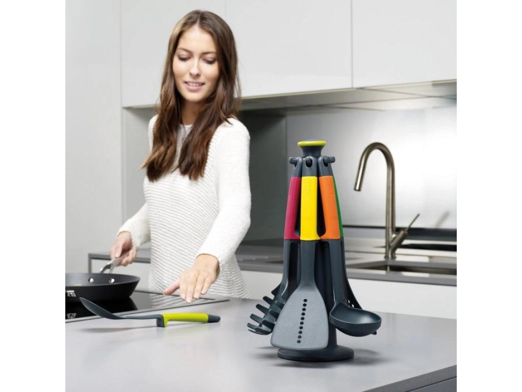 Stylová kuchyňská sada pomůcek se stojenem Elevate se stane nezbytným doplňkem vašeho kuchyňského vybavení. Sada obsahuje otočný stojan a celkem šest kuchyňských nástrojů, které vám usnadní jakékoliv vaření. Ergonomické rukojeti pomůcek disponují praktickou opěrkou, proto po odložení zůstává pracovní část nástroje vždy ve výšce nad pracovní plochou – tím zamezíte znečištění linky. Rukojeti nástrojů jsou vyrobeny ze silikonové gumy (odolná do teplot 270 °C) a pracovní části nástrojů jsou vyrobeny z nylonu (odolné do teplot 200 °C). Nylonové kontaktní části nástrojů jsou šetrné k nádobí s nepřilnavým povrchem. Stojan, vyrobený z ABS plastu, je otočný a disponuje protiskluznou gumovou základnou.