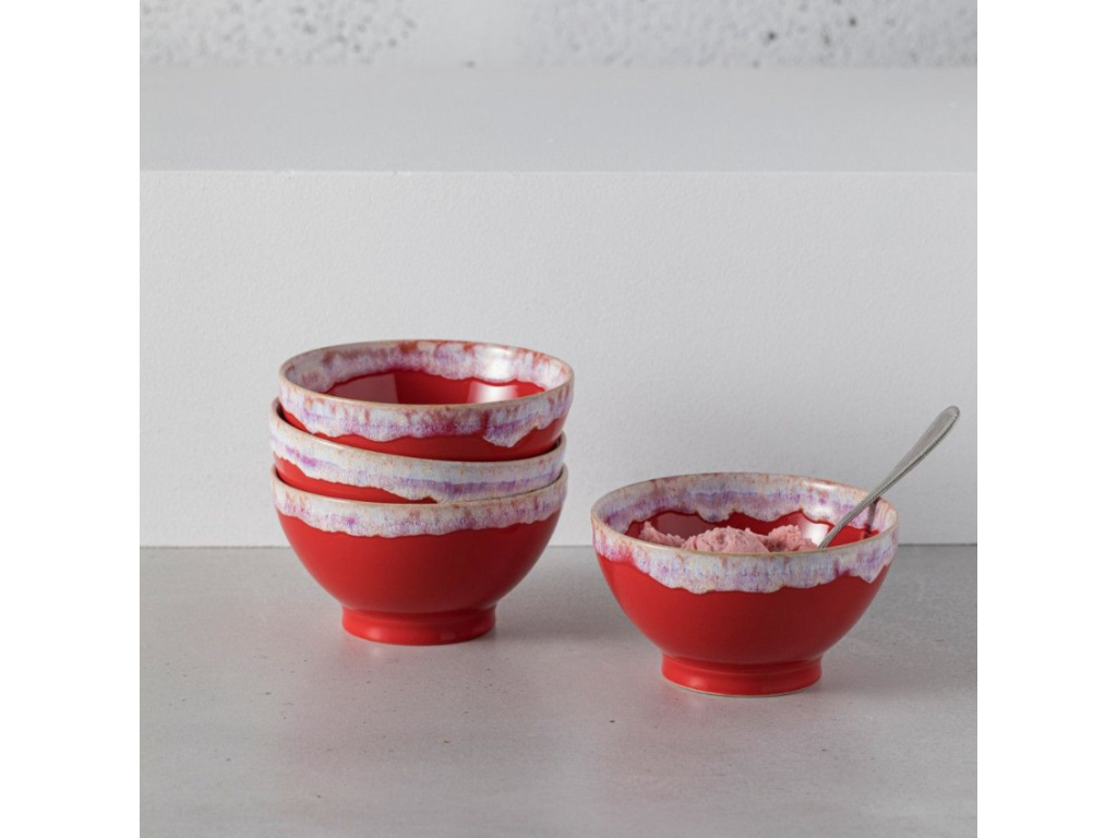 Tyto extravagantní kameninové misky se stanou ozdobou vaší kuchyně. Červená glazura s efektem volně stékající bílé barvy vytváří mnoho dalších odstínů, nejvýraznější jsou tak tóny fialové či béžové. Tento design působí velmi moderně, ale díky své struktuře také přirozeně. Osvěží každý stůl či stolek. Lze ji využít jako misky na dezert či polévku nebo také jako doplněk v interiéru. Misky na sebe upoutají každý pohled a uchvátí vás svou výrazností.
