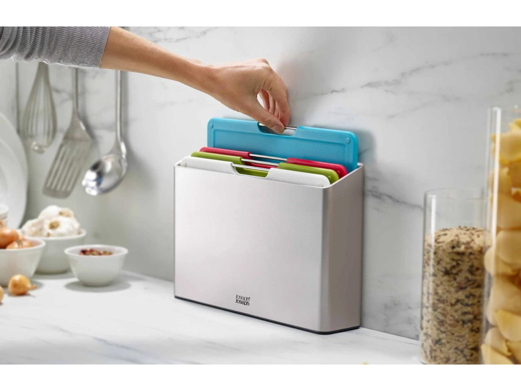 Dopřejte si pohodlné krájení se sadou prkének se stojanem Folio Special Pack! Sada obsahuje čtyři barevně odlišená plastová prkénka, určená pro hygienicky oddělené krájení potravin a kuchařský nůž z japonské nerezové oceli s integrovanou opěrkou a ochranným úložným pouzdrem. Vyjmutí prkének ze stojanu usnadňují nerezové úchytky a protiskluzová ochrana zajistí, že vám prkénko nebude klouzat po pracovní ploše. Každé prkénko také disponuje zvýšeným okrajem prosti stékání tekutin. Díky oddělenému umístění a cirkulaci vzduchu prkénka ve stojanu snadno osychají.