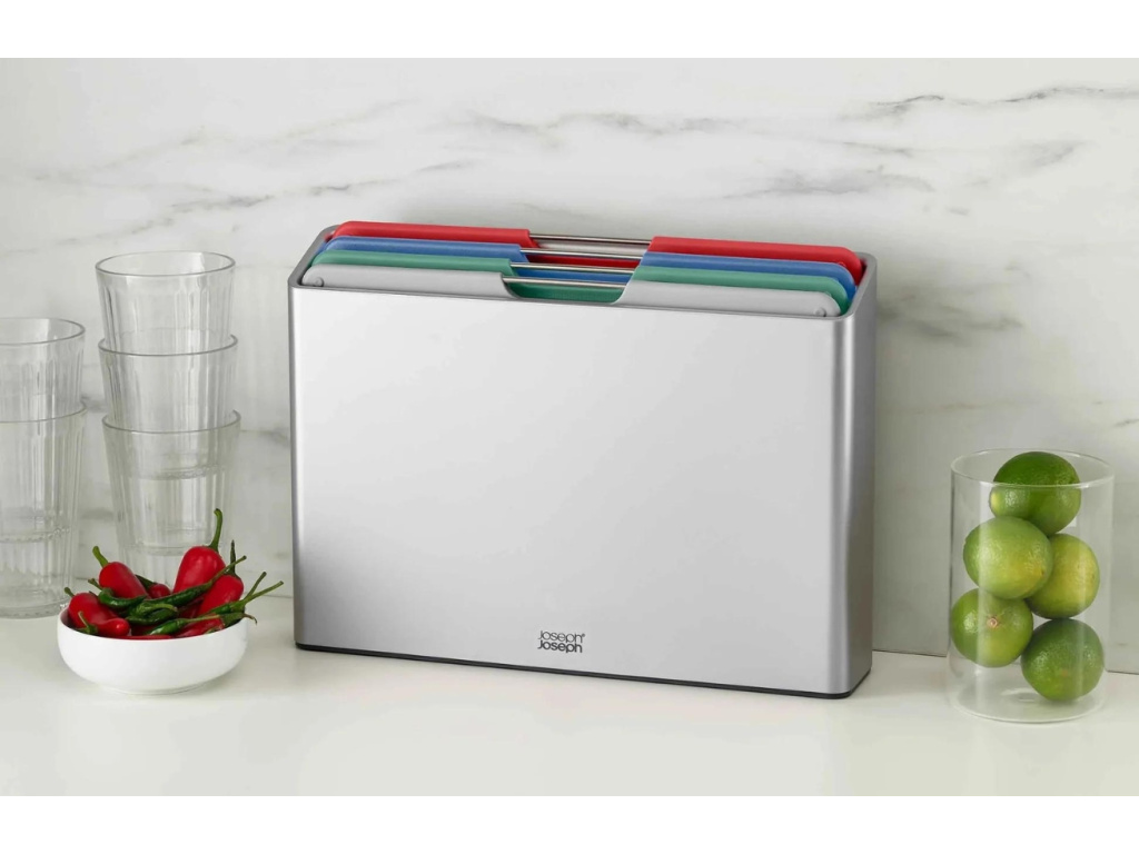 Dopřejte si pohodlné krájení se sadou prkének se stojanem Folio Silver Coast! Sada obsahuje čtyři barevně odlišená plastová prkénka, určená pro hygienicky oddělené krájení potravin. Vyjmutí prkének ze stojanu usnadňují nerezové úchytky a protiskluzová ochrana zajistí, že vám prkénko nebude klouzat po pracovní ploše. Každé prkénko také disponuje zvýšeným okrajem prosti stékání tekutin. Díky oddělenému umístění a cirkulaci vzduchu prkénka ve stojanu Folio snadno osychají.