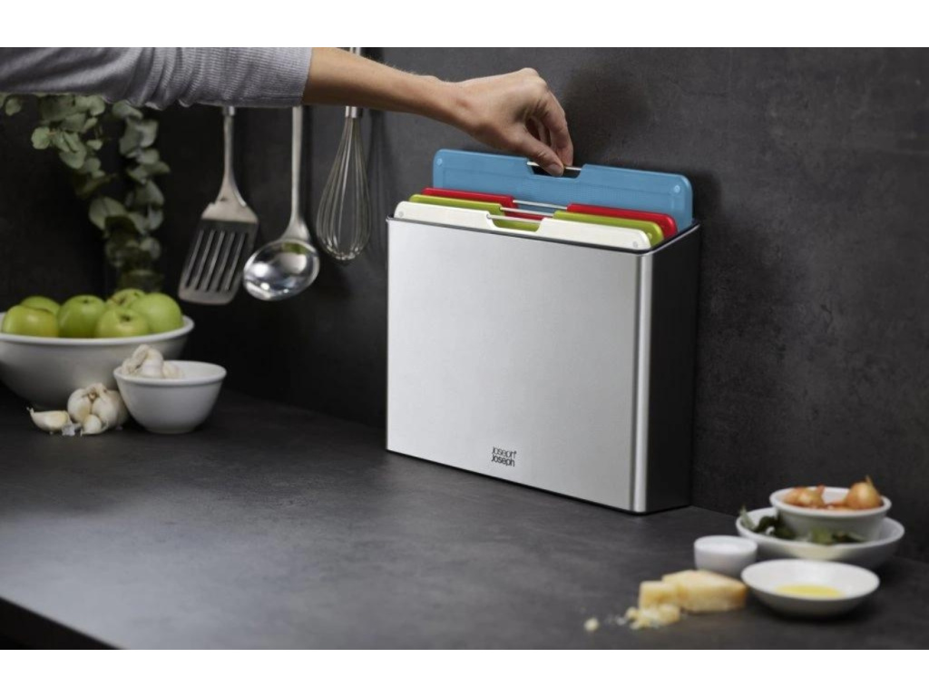 Dopřejte si pohodlné krájení se sadou prkének se stojanem Folio Steel Multicolour! Sada obsahuje čtyři barevně odlišená plastová prkénka, určená pro hygienicky oddělené krájení potravin. Vyjmutí prkének ze stojanu usnadňují nerezové úchytky a protiskluzová ochrana zajistí, že vám prkénko nebude klouzat po pracovní ploše. Každé prkénko také disponuje zvýšeným okrajem prosti stékání tekutin. Díky oddělenému umístění a cirkulaci vzduchu prkénka ve stojanu Folio snadno osychají.