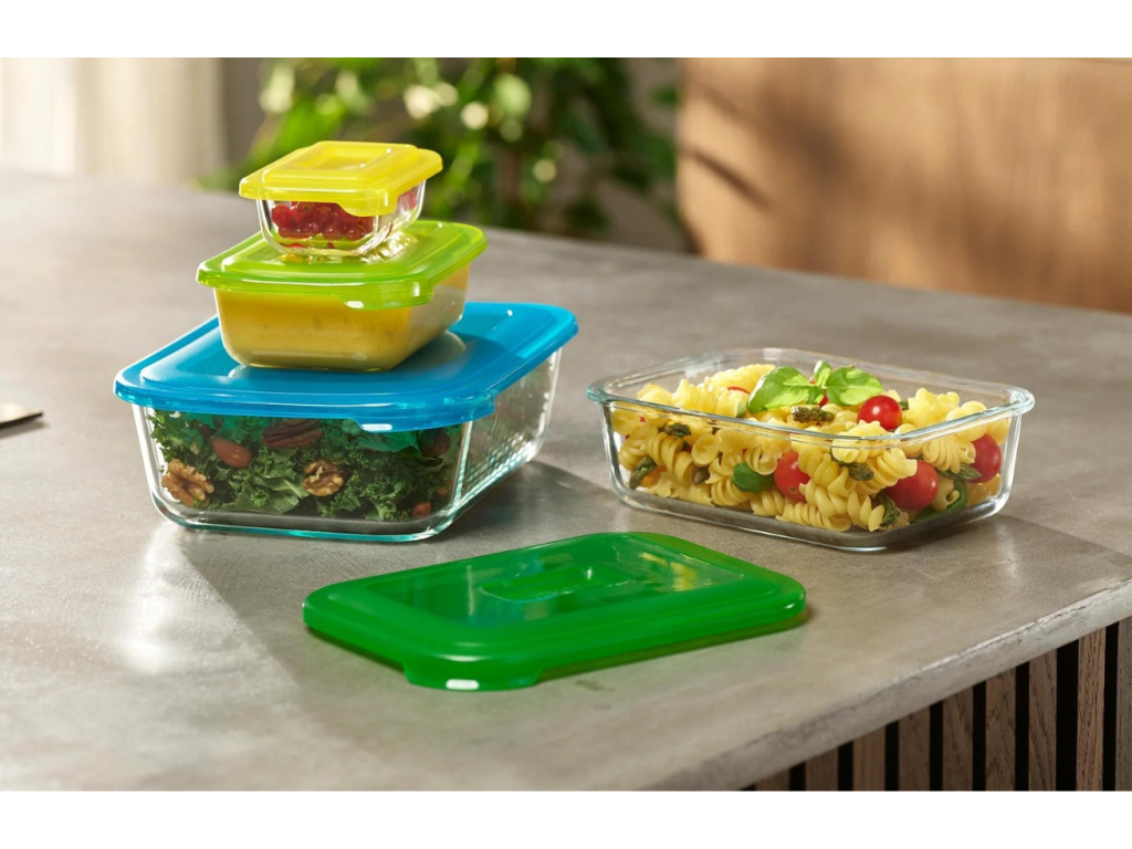 Praktické dózy na potraviny Nest Glass Storage od Joseph Joseph jsou vyrobené z borosilikátového skla, doplněny barevnými plastovými víky. Dózy jsou použitelné jako zapékací mísy (vhodné i pro ohřev v mikrovlnné troubě) a i pro skladování potravin v lednici. Nádoby perfektně zapadají jedna do druhé – nikdy nezabírají více prostoru než největší z misek. Chytře tvarovaná víka lze zaklapnout do sebe a skladovat zároveň s dózami.