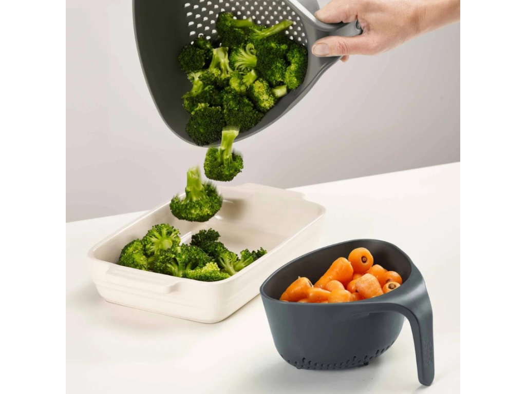 Sada praktických pomocníků do kuchyně v podobě dvou cedníků Nest Colanders od Joseph Joseph vám zaručí snadné a stabilní držení. To zajišťuje vertikálně tvarované madlo na každém jednotlivém cedníku. Druhá ruka zůstává volná a vy tak můžete lépe manipulovat s kohoutkem nebo kuchyňským načiním. Rohový tvar cedníků umožňuje snadnější vyjmutí a opláchnutých potravin a velkými vertikálními otvory snadno a rychle odtéká voda.