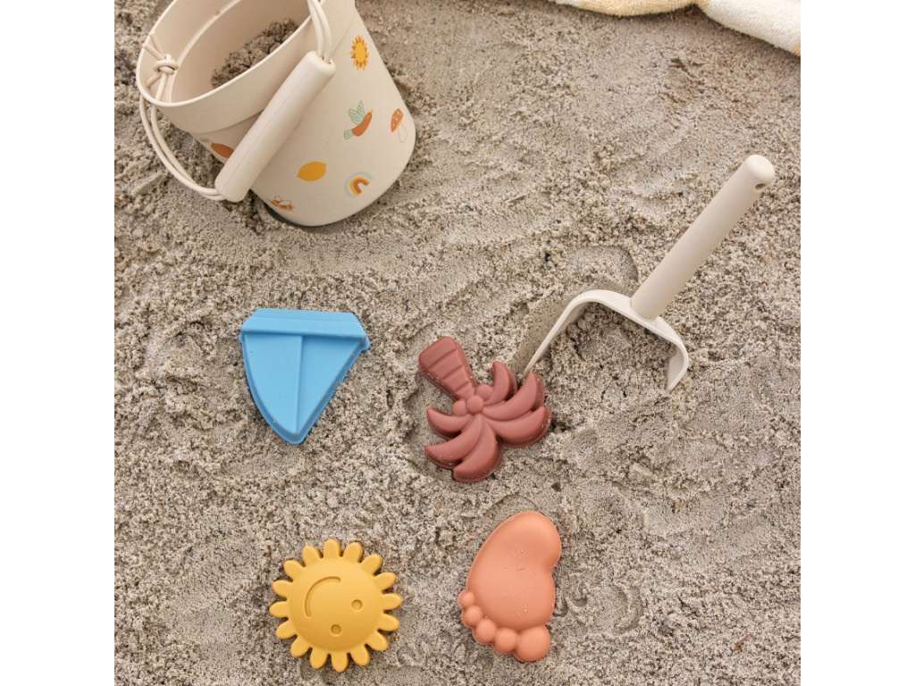 Sada kyblíku a formiček Agnes od značky Bloomingville zabaví vaše ratolesti ať už na dovolené na pláži nebo doma na pískovišti. Sada obsahuje kbelík, formičky různých tvarů a lopatku, která je ideálně vytvarovaná pro malé dětské ručičky. Veselé hravé barvy a roztomilé motivy upoutají pozornost každého malého raubíře. Doplňte tuto sadu o další zajímavé kousky ze stejnojmenné kolekce.