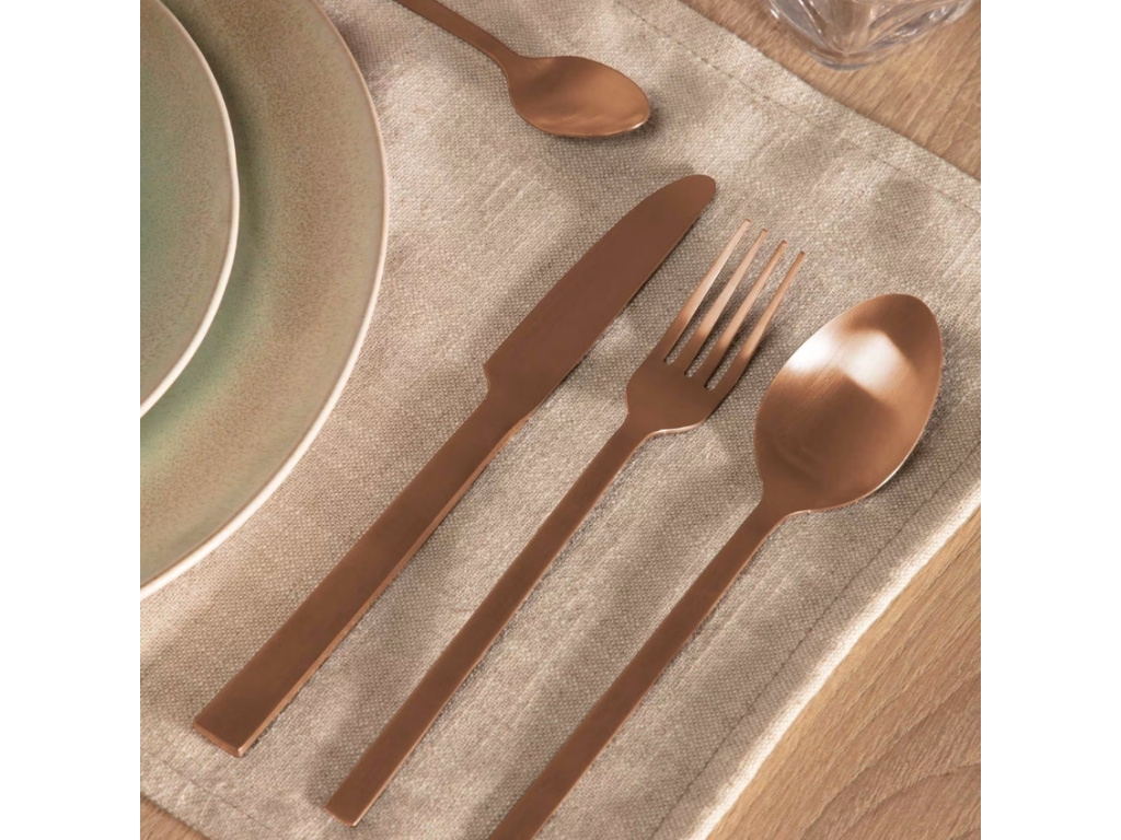 Sada příborů Kelda povýší vaše stolování na novou úroveň. Obsahuje 4 vidličky, 4 nože, 4 lžíce a 4 lžičky, vyrobené z kvalitní nerezové oceli s jedinečnou měděnou úpravou. Tento stylový set je ideální pro každodenní využití i slavnostní příležitosti. Oživte svůj stůl a dopřejte mu sofistikovaný vzhled s příbory Kelda.