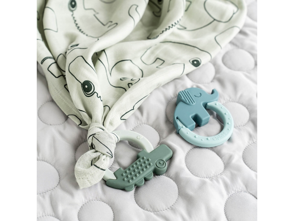 Slon Elphee a krokodýl Croco tady budou pro všechna děťátka, kterým začínají růst zoubky. Sada dvou silikonových kousátek od Done by Deer se snadno drží v dětských ručičkách, a různé tvary a textury pomohou stimulovat a zklidnit bolavé dásně. Kousátka lze mýt v myčce na nádobí nebo sterilizovat vroucí vodou. Sada je skvělým dárkem například k narození miminka.