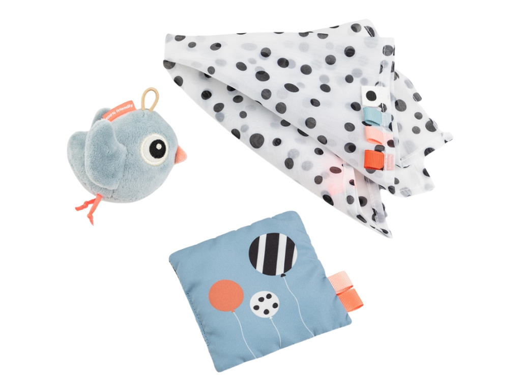 Kouzelné hračky Tiny Birdee od Done by Deer jsou perfektní startovací sadou pro miminka již od narození. Roztomilý ptáček Birdee zabaví děťátko chrastivými zvuky, barevný muchláček zaujme šustivými zvuky listů a kontrastními barvami a se šátečkem můžete hrát s děťátkem na schovávanou. Sada hraček je ideálním dárkem například k narození miminka.