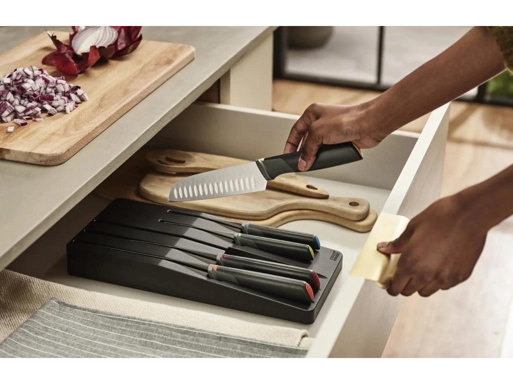 Zásuvkový organizér se sadou 5 nožů Elevate Knives Store vám jednoznačně usnadní krájení a vaření. Kuchyňské nože jsou vyrobeny z japonské nerezové oceli s ergonomickými rukojeťmi. Rukojeti s integrovanou opěrkou zajišťují, že se po odložení čepel nože nedotkne pracovní plochy, a díky tomu zamezíte nepořádku na pracovní ploše. Nože jsou odlišené barevnými prvky pro přehledné skladování a organizér disponuje protiskluzovými nožičkami, které zajistí, že nebude klouzat po pracovní ploše.