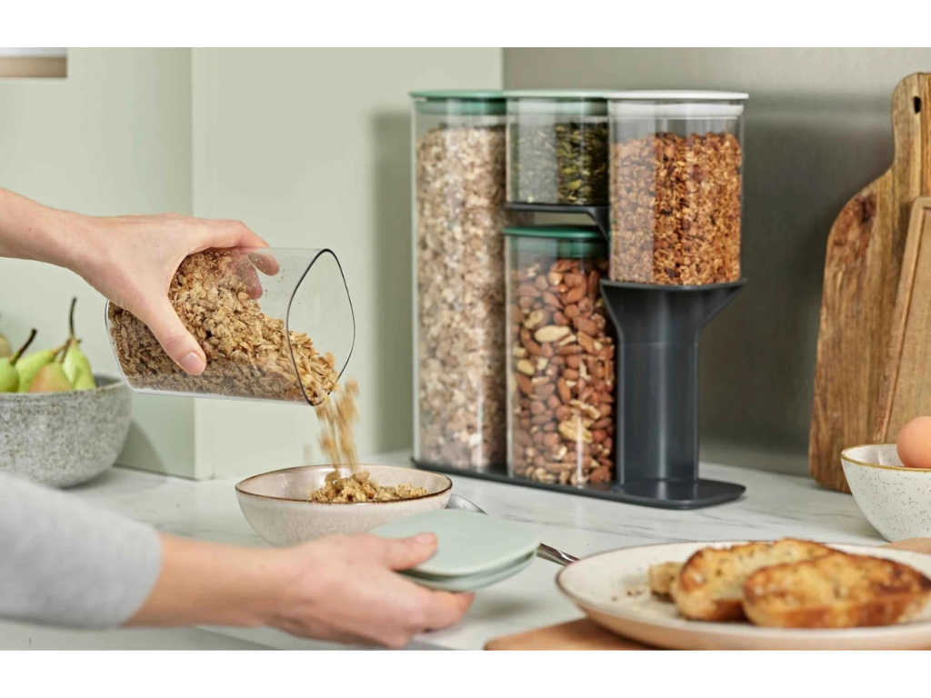 Pokud chcete uchovávat trvanlivé potraviny stylově, jsou dózy Podium jednoznačně tím správným řešením! Sada se skládá z pěti plastových úložných dóz a je vybavena chytrým stojanem, který umožňuje snadný přístup k jakékoliv nádobě bez ohledu na její polohu. Nádoby jsou vybaveny víky se vzduchotěsným silikonovým těsněním a zakulacenými rohy pro snadné vyprázdnění potravin. Stojan disponuje protiskluzovým povrchem, a proto nebude klouzat po pracovní lince.