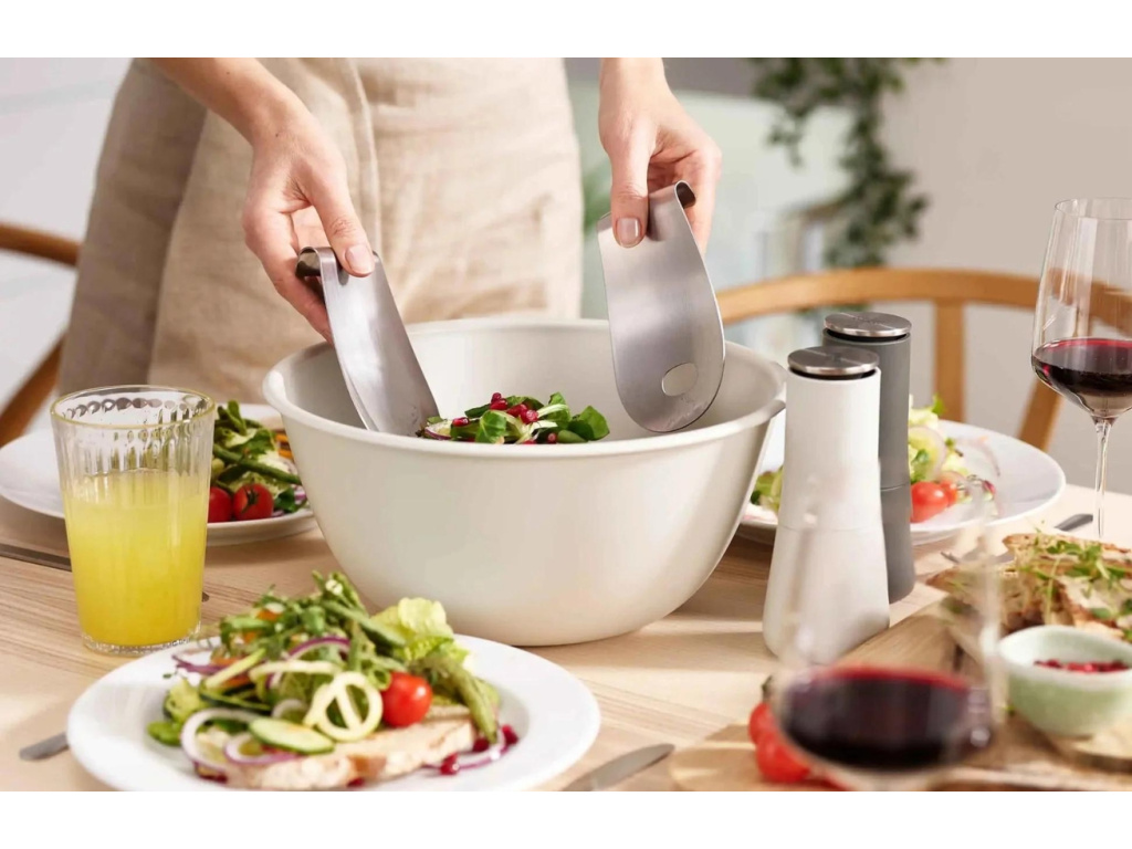 Usnadněte si přípravu vašeho oblíbeného jídla se salátovou mísou a mlýnky na pepř a sůl Serve It In Style! Mísa Uno disponuje praktickými nerezovými lžícemi, které budete mít vždy po ruce – ukládají se totiž přímo na hranu salátové mísy. Mísa je vhodná k servírování salátů, rýže či těstovin. S mlýnky nehrozí odpadávání zbytků pepře a soli po odložení na pracovní nebo jídelní plochu. Po užití mlýnek otočíte mechanikou vzhůru a zbytky pepře nebo soli propadnou zpět do zásobníků. Univerzální keramická mlecí mechanika mlýnků je zakryta elegantním nerezovým kolečkem, jehož otáčením se nastavuje hrubost mletí.