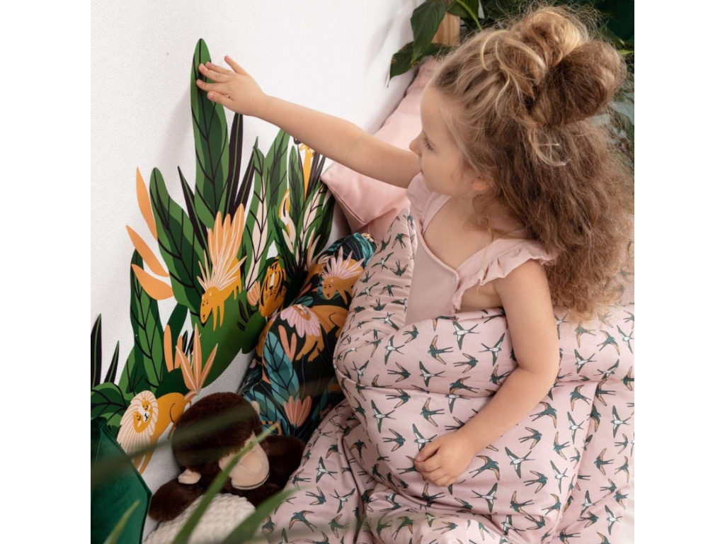 Sada samolepek na zeď Jungle Life vám pomůže v dětském pokoji vytvořit jedinečné místo, plné dobrodružství a tajů džungle. Mnoho pestrých barev, rostlin a zvířátek spolu s originálním designem tvoří výjimečnou dekoraci, s níž snadno ozdobíte prázdné zdi. Samolepka je zhotovena technologií Easy Dot (speciální fólie s bodovým lepidlem), díky níž je aplikace nesmírně jednoduchá. Samolepky můžete opakovaně přelepovat z místa na místo - beze strachu ze zničení povrchu nebo samolepky samotné. V dětském pokoji vynikne například nad postýlkou či pohovkou, a můžete ji doplnit o další zajímavé samolepky z kolekce Jungle Life od značky Yellow Tipi.