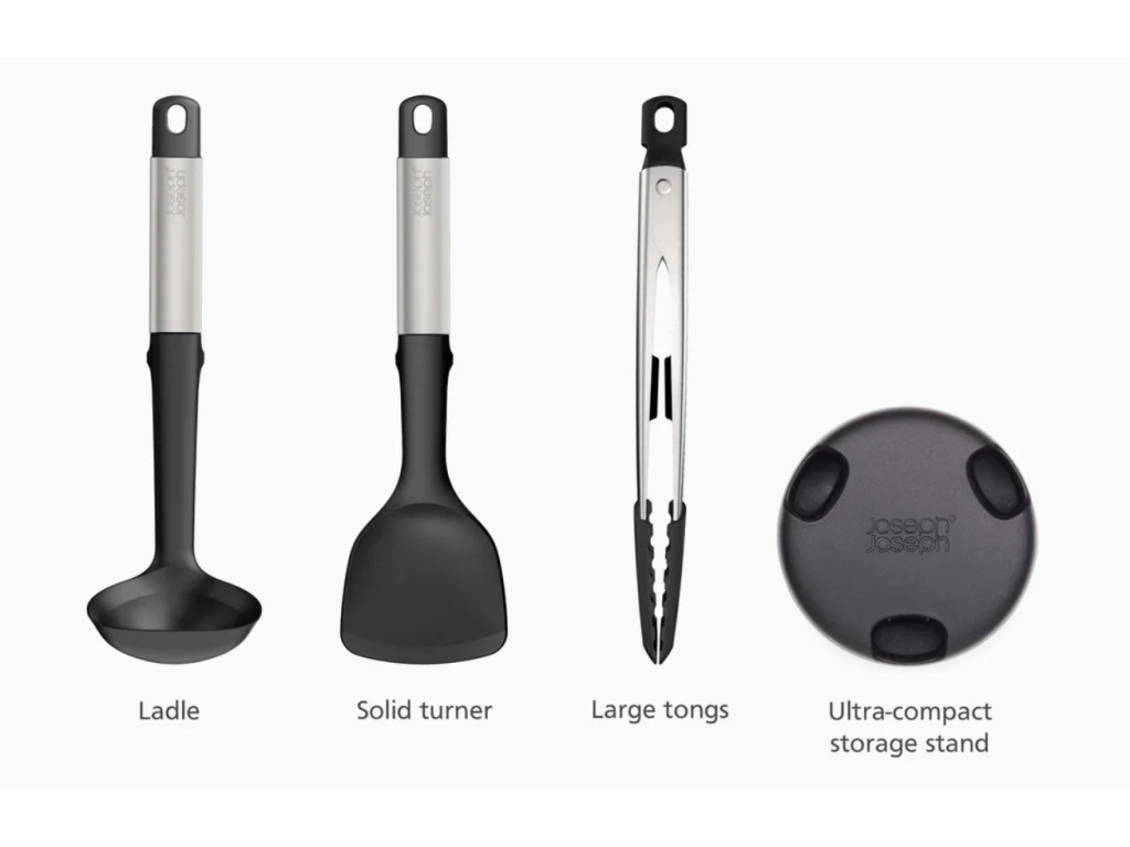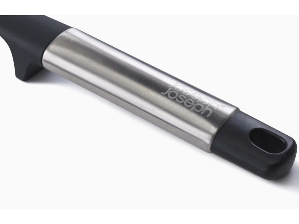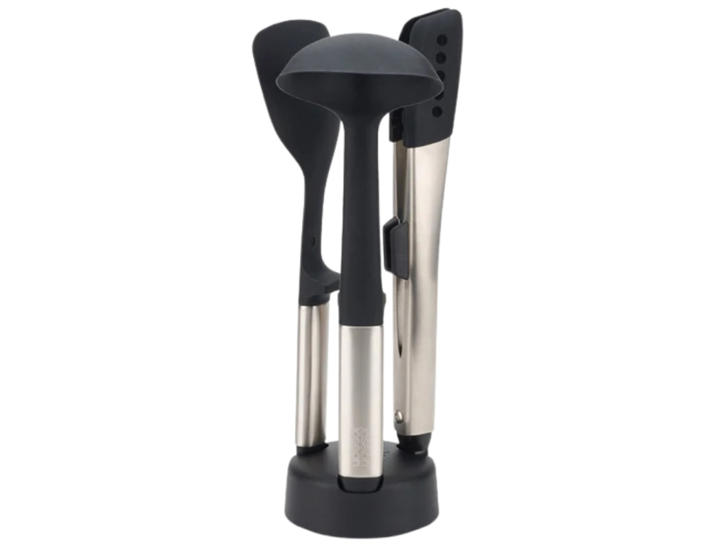 Sada kuchyňských pomůcek Elevate Fusion od značky Joseph Joseph je důmyslně navržená tak, aby vám zpříjemnila vaření a zároveň udržela kuchyňskou linku dokonale čistou. Každý kousek – obracečka, naběračka i kleště – má speciálně vyváženou rukojeť a integrovanou opěrku, takže když nástroj odložíte, pracovní část zůstává elegantně „ve vzduchu“. Nástroje kombinují pevnou nerezovou rukojeť s teplu odolným silikonem, který je šetrný i k tomu nejcitlivějšímu nepřilnavému povrchu. Kleště zvládnou teploty až 270 °C, ostatní náčiní do 210 °C – takže se nemusíte bát ani pořádně rozžhavené pánve. Vše navíc přehledně uložíte do kompaktního stojánku, který nejen šetří místo, ale stylově doplní vaši kuchyňskou linku. Elevate Fusion je víc než jen sada pomůcek – je to každodenní pomocník, který propojuje chytrý design s maximální praktičností.