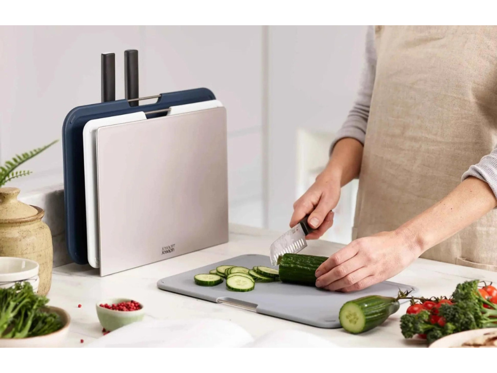 Dopřejte si pohodlné krájení se sadou prkének se stojanem Nest Plus! Sada obsahuje tři barevně odlišená plastová prkénka, určená pro hygienicky oddělené krájení potravin a sadu tří nožů z japonské nerezové oceli s ergonomickou soft-grip rukojetí. Vyjmutí prkének ze stojanu usnadňují nerezové úchytky a protiskluzová ochrana zajistí, že vám prkénko nebude klouzat po pracovní ploše. Každé prkénko také disponuje zvýšeným okrajem prosti stékání tekutin. Díky oddělenému umístění a cirkulaci vzduchu prkénka ve stojanu Nest snadno osychají.