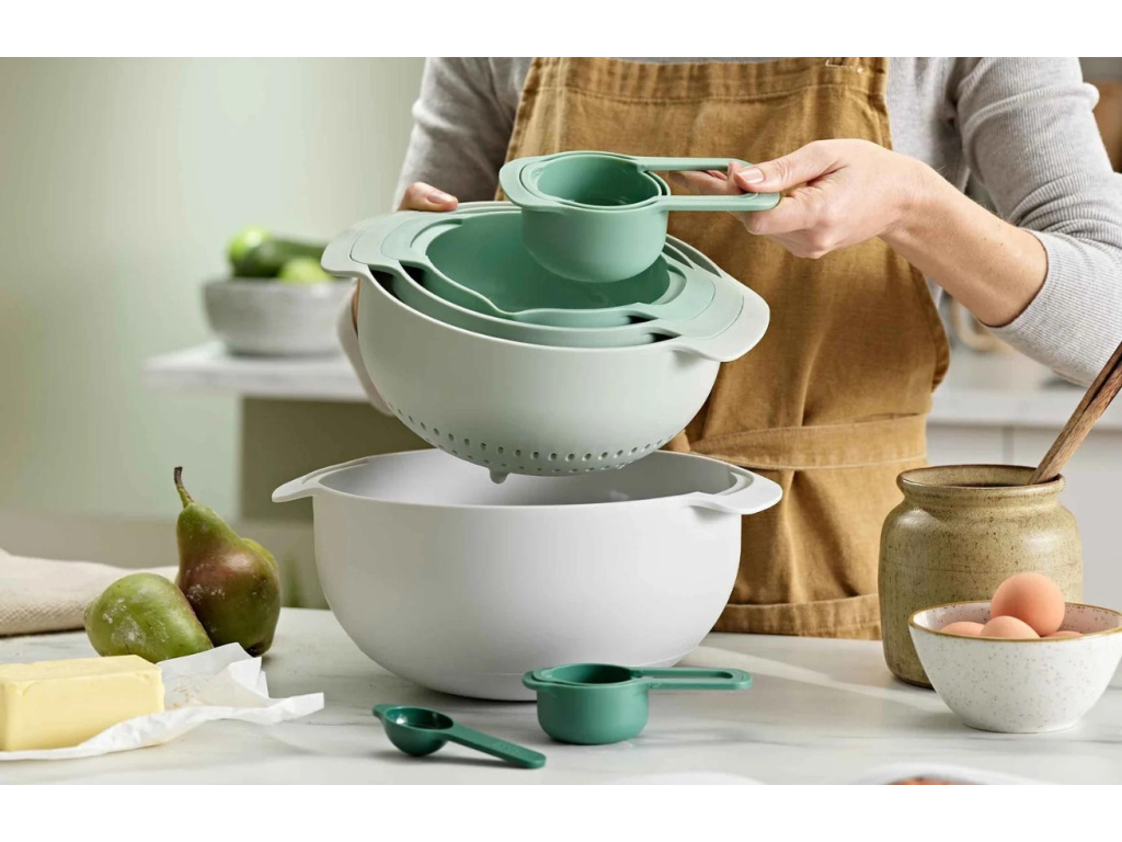 Stylová sada misek a odměrek Nest 9 Plus obsahuje celkem devět různých nezbytností pro přípravu oblíbeného jídla. Všechny položky se dají úhledně složit do sebe, pokud se zrovna nepoužívají. Při uložení například do skříně tak ušetří místo a zaberou méně prostoru. Sada obsahuje dvě nádoby na mixování s protiskluzovým dnem, jedno sítko, jeden cedník a pět plastových odměrek. Zkrátka téměř vše, co potřebujete k pečení vašeho oblíbeného dezertu.