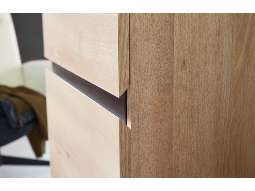 Šatní skříň Lissabon je vyhotovena v přírodním dekoru bukového dřeva. Uvnitř se nachází 4 police, které lze umístit podle potřeby. V prostřední části je zabudovaná výsuvná šatní tyč. Skříň má zabudované tlumiče dveří, které snižují opotřebení materiálu a vysoce kvalitní ABS hrany. Lissabon bude skvěle ladit s ostatními kousky nábytku ze stejné kolekce nebo s dřevěnými prvky v moderním stylu.