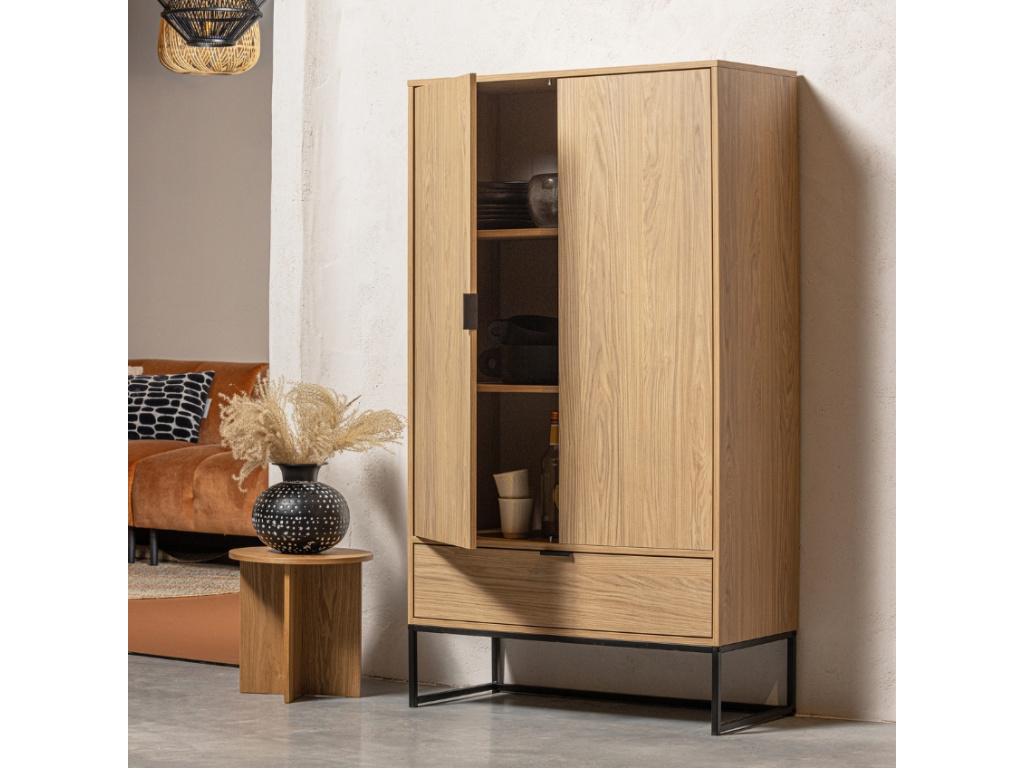 Šatní skříň Sinai nabízí praktický úložný prostor v podobě tří uzavřených polic s dvířky a jedné hluboké zásuvky. Deska z melaminu v přírodním dekoru dubu je doplněna o černě lakovanou kovovou podnož a vytváří tak moderní kontrast. Je to minimalistická skříň, která se dobře kombinuje s dalším nábytkem. Zapadne do moderních i klasicky zařízených interiérů. Skvěle ji doplní další produkty ze stejné série Sinai.