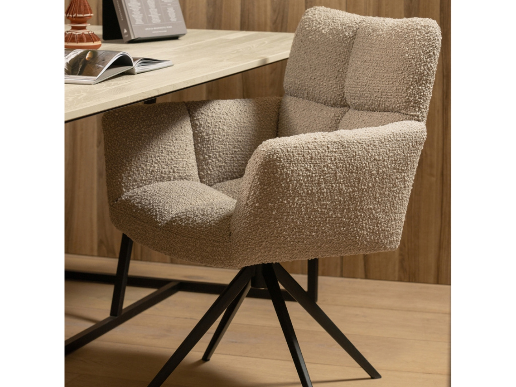 Design jídelní židle Darin, který má v sobě lehký nádech retra, si snadno zamilujete hned po prvním sednutí. Prošívání zvýrazňuje nadýchaný a maximálně pohodlný sedák, ze kterého se vám nebude chtít vstávat. Spojení měkké bouclé látky v šedé barvě a kovové otočné podnože vytváří uměleckou kompozici, která s sebou přináší osobitost a originalitu.