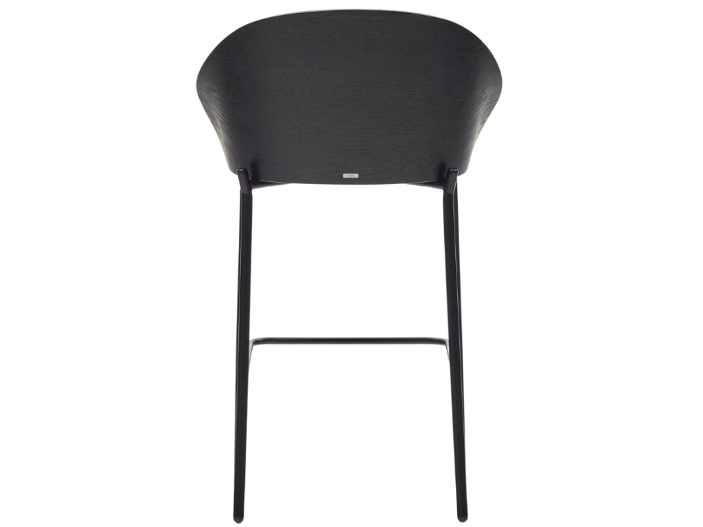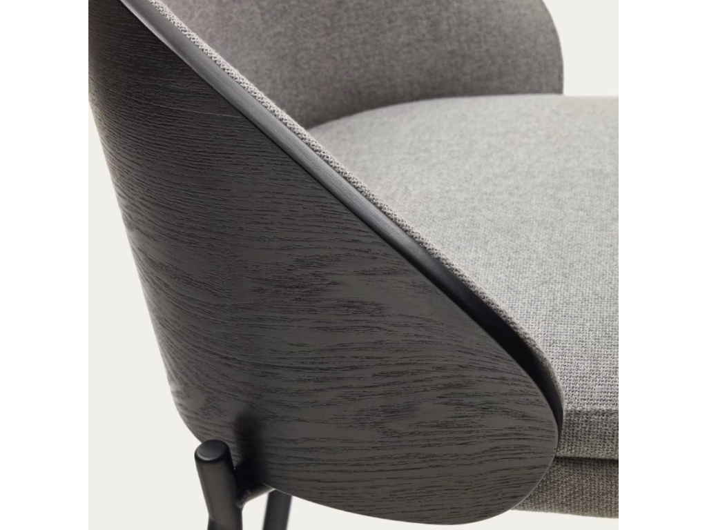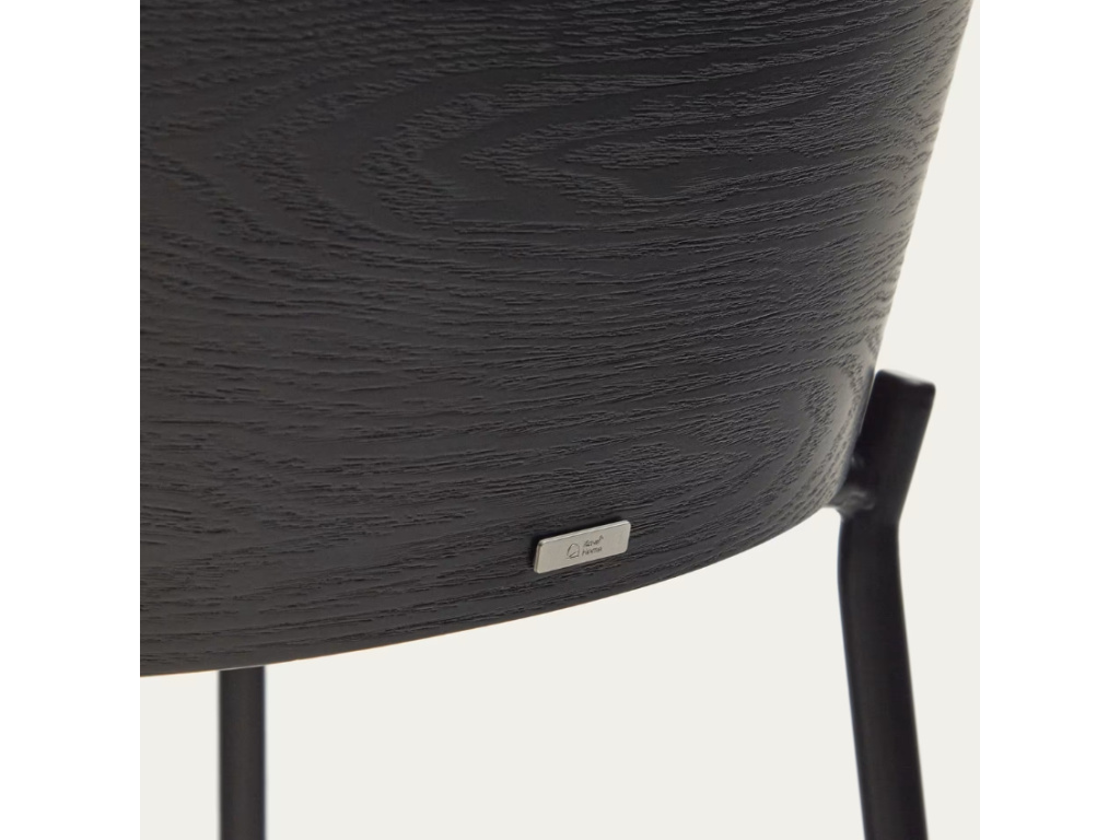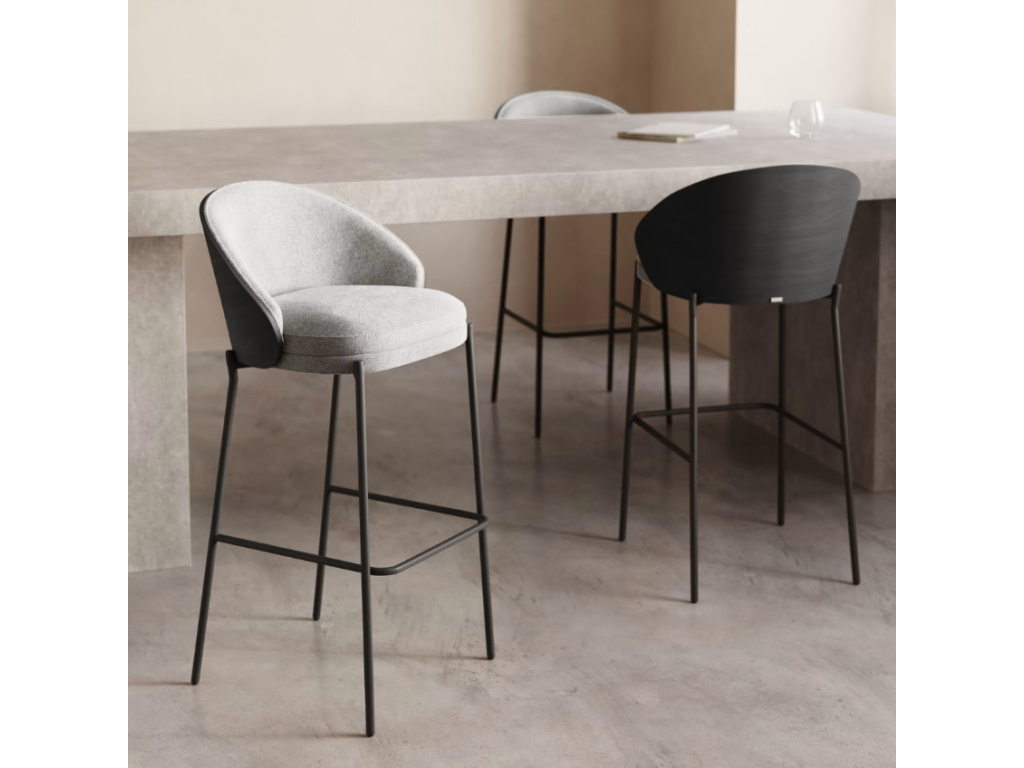 Barová židle Kave Home Eamy zaujme svým prostorným opěradlem, vyrobeným z černě zbarvené jasanové dýhy s krásnou výraznou kresbou. Vkusně jej doplňuje látkové čalounění světle šedé barvy a štíhlá kovová podnož s opěrkou na nohy. Eamy bude u barového pultu i kuchyňského ostrůvku nejen pohodlným místem k sezením, ale také designovým kouskem, který dodá celé místnosti styl. Dostupná je ve třech barevných variantách.
