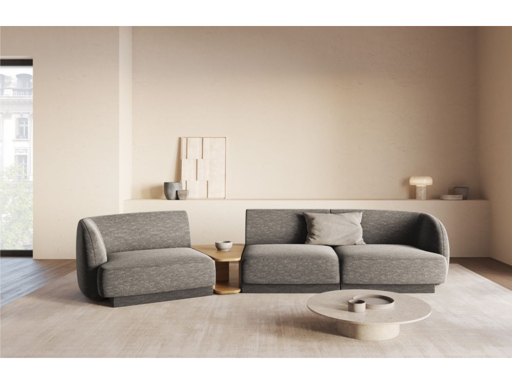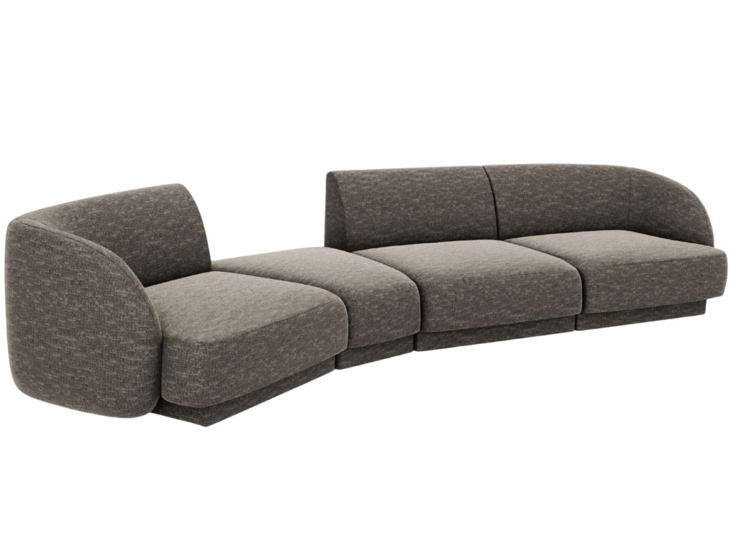 Čtyřmístnou pohovku Miley od značky Micadoni si zamilujete! Její elegantně obloukovité opěradlo vás doslova zve k odpočinku, zatímco jemně zapuštěná základna dodává celému kusu vzdušnost a lehkost. Žinylková potahová látka je velmi příjemná až téměř hedvábná na dotek. Probarvené nitě vytvářejí poutavou 3D strukturu se stínovým a lesklým efektem. Tkanina je velmi odolná proti oděru, díky tomu je pohovka vhodná i do komerčních prostor. Vysoká kvalita a neobyčejný vzhled látky dodávají nábytku sofistikovaný dojem, který umožňuje jeho široké využití v moderním nebo skandinávském stylu. Integrovaný konferenční stolek je nejen designovým prvkem, ale také praktickým místem pro odložení věcí, které chcete mít po ruce, nebo pro umístění dekorací. K pohovce je možné přikoupit další produkty z kolekce Miley. Díky tomu si můžete vytvořit sedací soupravu, kterou je vhodné kombinovat se skleněným nebo dřevěným konferenčním stolkem.