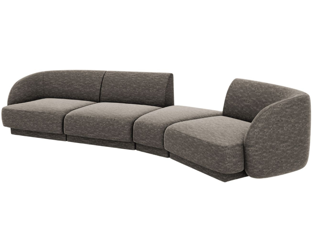Čtyřmístnou pohovku Miley od značky Micadoni si zamilujete! Její elegantně obloukovité opěradlo vás doslova zve k odpočinku, zatímco jemně zapuštěná základna dodává celému kusu vzdušnost a lehkost. Žinylková potahová látka je velmi příjemná až téměř hedvábná na dotek. Probarvené nitě vytvářejí poutavou 3D strukturu se stínovým a lesklým efektem. Tkanina je velmi odolná proti oděru, díky tomu je pohovka vhodná i do komerčních prostor. Vysoká kvalita a neobyčejný vzhled látky dodávají nábytku sofistikovaný dojem, který umožňuje jeho široké využití v moderním nebo skandinávském stylu. Integrovaný konferenční stolek je nejen designovým prvkem, ale také praktickým místem pro odložení věcí, které chcete mít po ruce, nebo pro umístění dekorací. K pohovce je možné přikoupit další produkty z kolekce Miley. Díky tomu si můžete vytvořit sedací soupravu, kterou je vhodné kombinovat se skleněným nebo dřevěným konferenčním stolkem.
