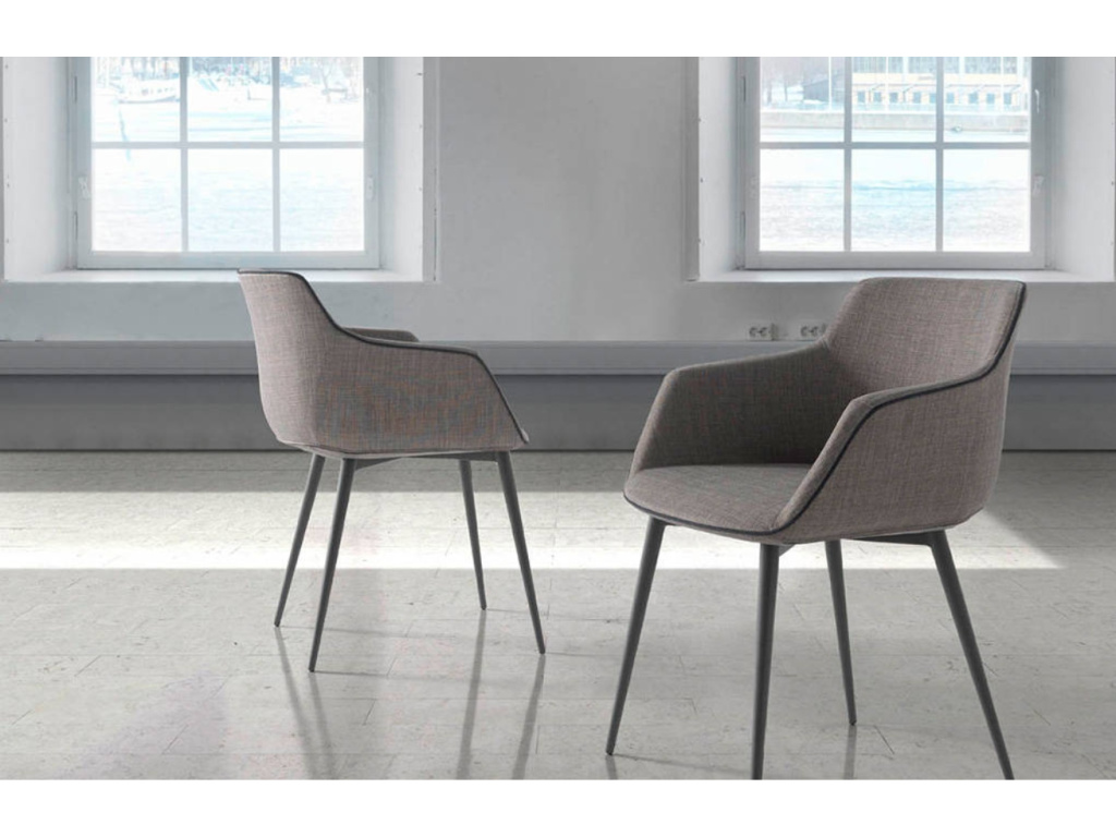 Elegantní židle od Angel Cerdá zaujme svým čalouněním látkou s jemným vzorkem, které je obohacené o stylové černé lemování. To se hezky doplňuje s kónicky se zužující minimalistickou podnoží z černě lakované oceli. Ergonomický tvar opěradla s područkami nabízí maximální pohodlí, které jistě uvítáte v jídelně, obývacím pokoji i v pracovně. Židle se svým sofistikovaným nadčasovým designem doplní každý moderní interiér.