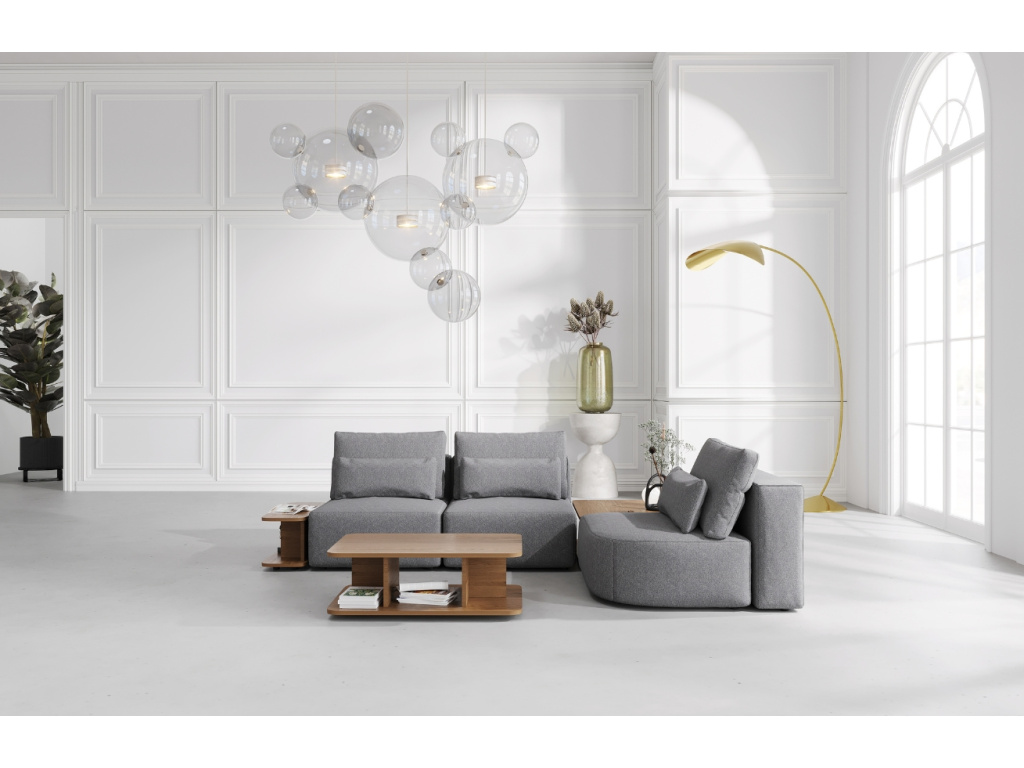 Více infoŠedá čalouněná modulární pohovka Riposo 290 cm se stolky