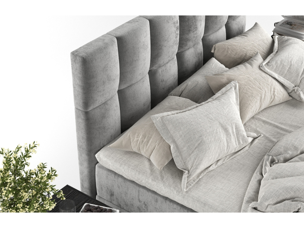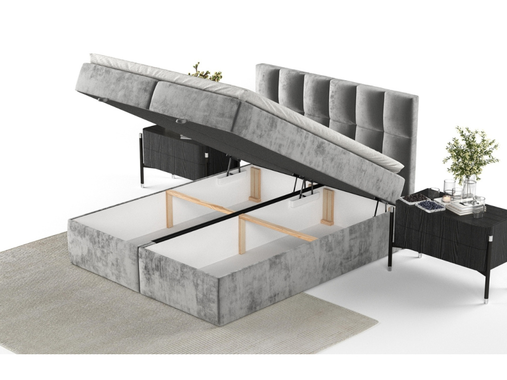 Boxspring postel ESSENCE bude stylovým doplňkem do vaší ložnice, který je zároveň velmi praktický. Tato postel vám poskytne úložný prostor o výšce 34 cm na uschování lůžkovin nebo jiných předmětů. Také přichází s kvalitní matrací s bonellovými pružinami a oboustranným topperem – vrchní matrací, která zvyšuje pohodlí a chrání matraci před znečištěním. Čelo postele upoutá svým prošíváním, které vytváří obdélníkové tvary a dodává celé posteli jedinečný charakter. Na dotek příjemné žinylkové čalounění se pyšní 3D efektem a dává posteli vizuálně zajímavý vzhled. Pokud si ESSENCE vyberete do vaší ložnice, rozhodně nebudete zklamáni!