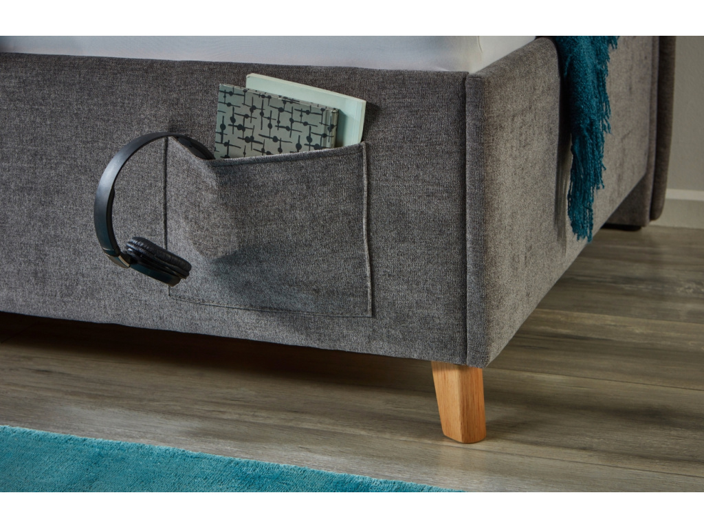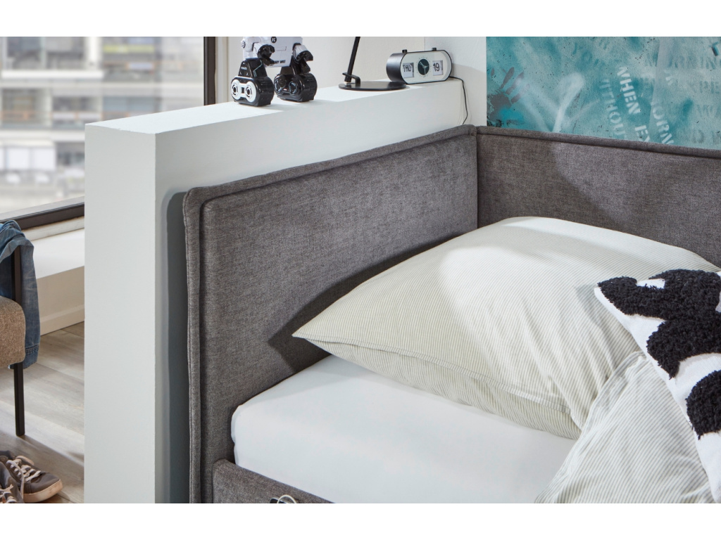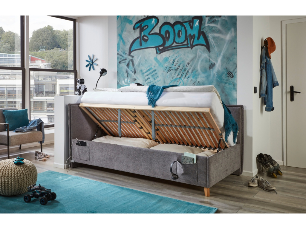Stylová postel Fun s čalouněným rámem i prostorným čelem je skvělou volbou pro dětské i studentské pokoje. Na jejím boku najdete prostorné kapsy, do kterých se vejde vše, co bude potřeba mít před spaním po ruce – knížka, časopis, herní konzole i drobné hračky či brýle na čtení. Dalším praktickým detailem je zabudovaný výstup pro USB i USB-C, díky kterému je možné nabíjet telefon, MP3 přehrávač nebo třeba hodinky. Postel Fun je navíc dostupná ve čtyřech barvách, ze kterých si vyberou kluci i holky. K dostání je také varianta bez čalouněného bočního panelu.