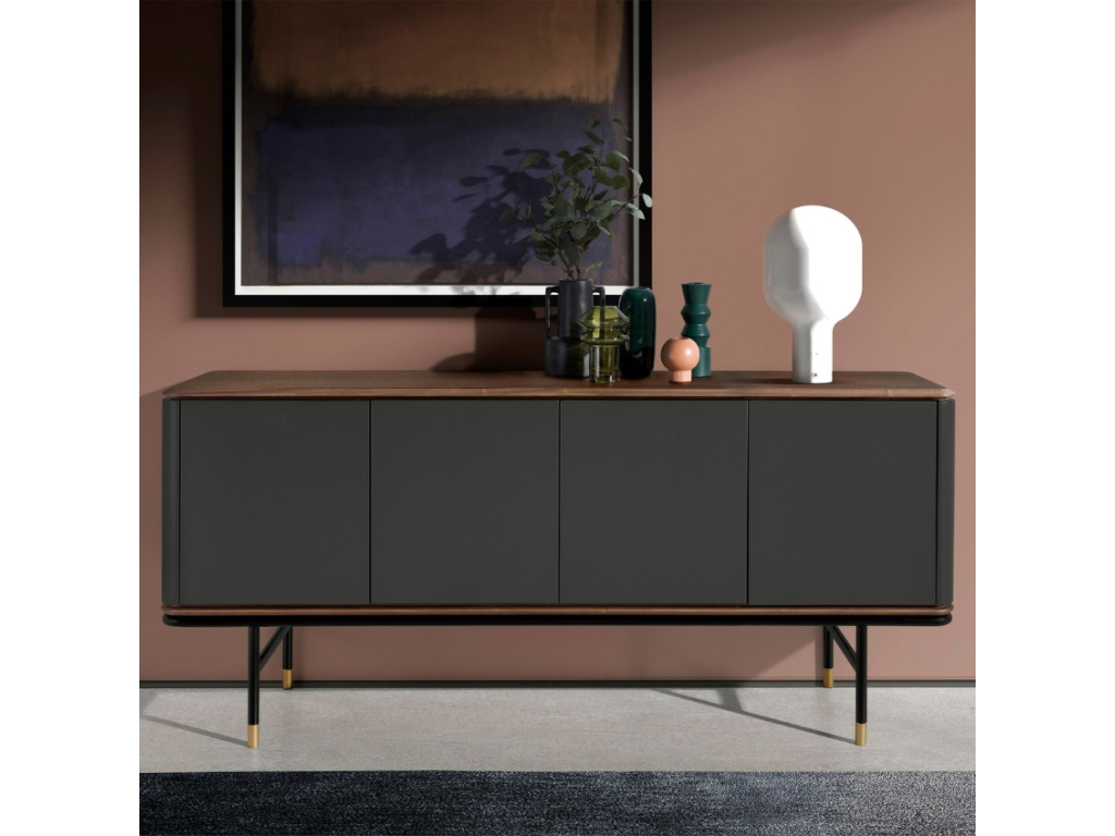 Tato minimalistická komoda okouzlí svým sofistikovaným vzhledem a moderním kontrastem materiálů. Matně šedá lakovaná MDF působí elegantně a decentně, zatímco vrchní deska z přírodní ořechové dýhy dodává jemný přírodní prvek. Celek dokresluje černá kovová podnož se zlatými detaily podtrhující nadčasový vzhled. Komoda skvěle zapadne do interiérů inspirovaných skandinávským nebo industriálním stylem, kde bude nejen praktickým úložným prostorem, ale i výrazným designovým prvkem.
