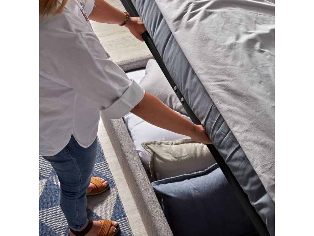 Čalouněná dvoulůžková postel Kave Home Nahiri disponuje praktickým úložným prostorem, který využijete například k uložení peřin a polštářů. K úložnému prostoru se snadno dostanete díky výklopnému roštu s plynovým pístovým mechanismem. Látkové čalounění šedé barvy je doplněno plastovou podnoží, která je opatřena podložkami, chránícími podlahu před poškozením. Jednoduchý design postele s sebou do interiéru přinese nádech elegance. Postel skvěle zapadne do ložnic laděných v moderním i klasickém stylu.