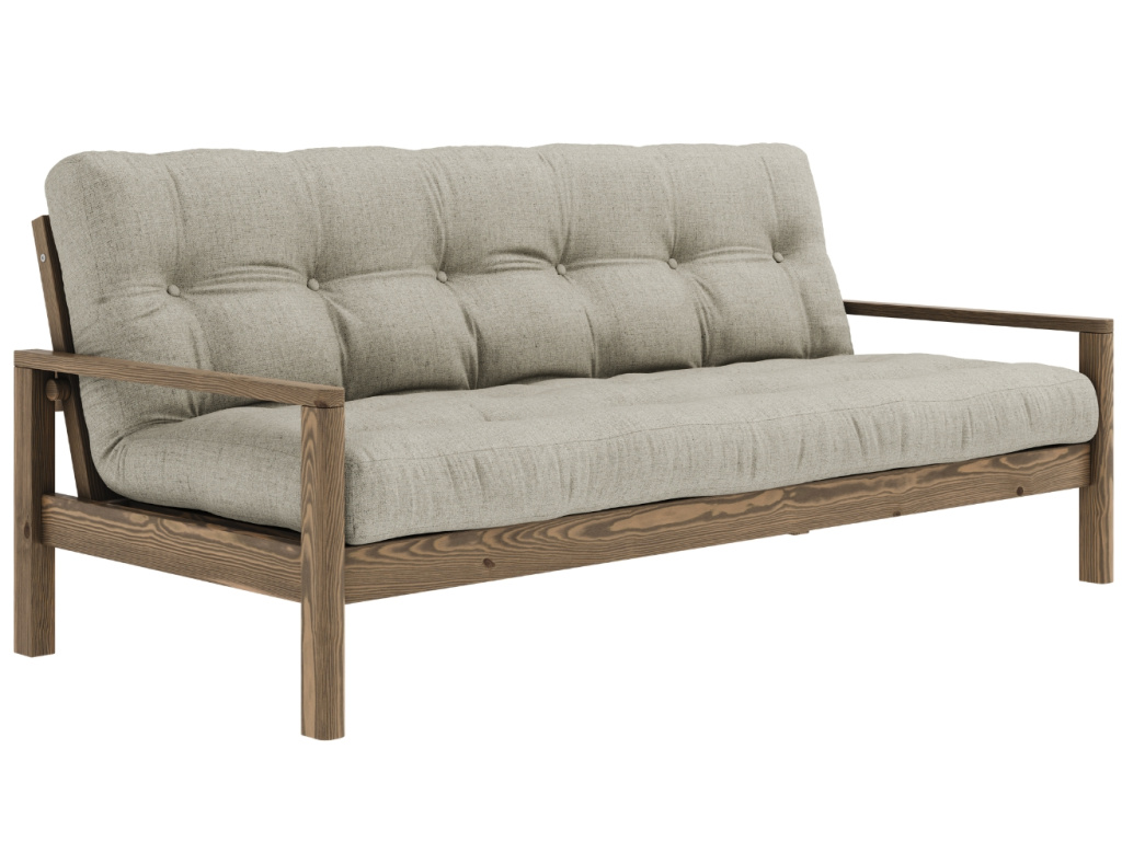 Pohovka nebo postel? Trojmístná rozkládací pohovka Knob od dánské značky Karup Design umí být obojím! Pod dřevěnými područkami se nachází dva nenápadné úchyty, které lze snadno odšroubovat a vy tak během chvilky získáte pohodlné lůžko pro vás nebo vaše hosty. Konstrukce z masivního borovicového dřeva s FSC certifikací je doplněna kvalitní 14cm futonovou matraci, která v sobě kombinuje recyklovaná vlákna a 4 cm pěny. Pohovka Knob fantasticky zapadne do skandinávských a japonských stylů interiérů, do kterých vnese jednoduchost, eleganci a ryzí funkčnost. Představuje skvělé řešení zejména pro menší prostory, do kterých přinese další místo na spaní. Vybrat si ji můžete v další barvě konstrukce či v mnoha barvách matrací.