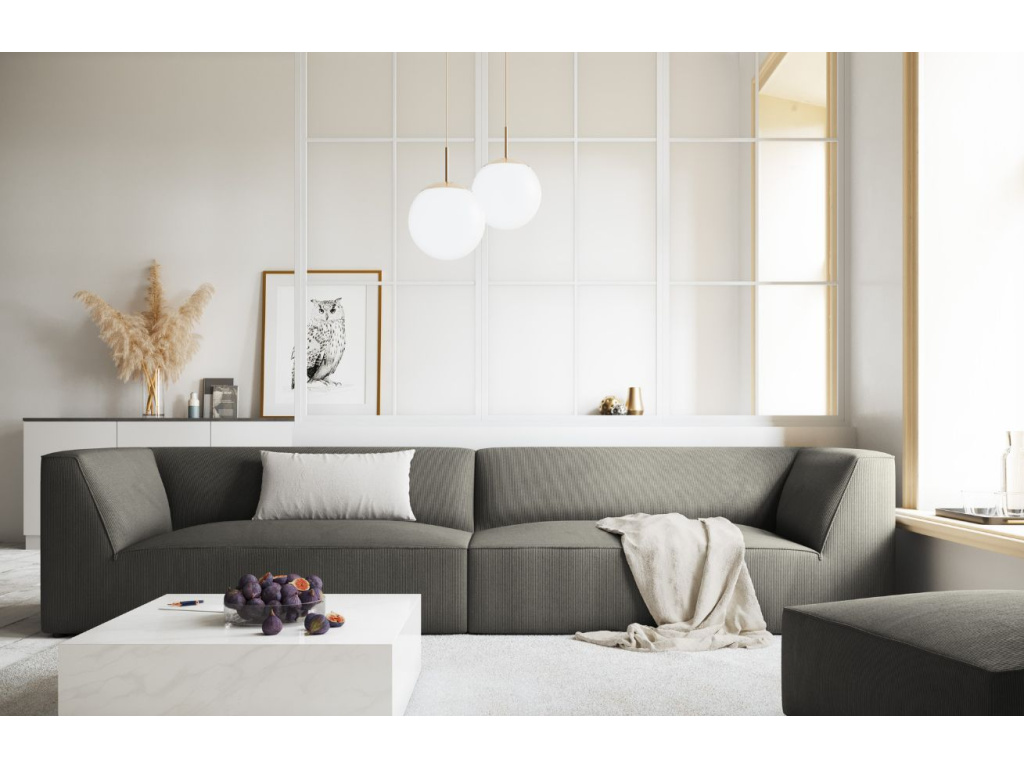 Čtyřmístná pohovka Ruby od společnosti Micadoni se stane příjemným doplňkem vašeho obývacího pokoje. Matná manšestrová tkanina, se strukturovaným dekorem v podobě proužků, je velmi příjemná na dotek. Látka je pokryta hydrofobní vrstvou, která chrání před rychlou absorpcí rozlité kapaliny do struktury nábytku. Navíc disponuje vysokou odolností proti oděru. Kombinací různých modulů a velikostí pohovky si můžete vytvořit konfigurace sezení podle svých představ. Sezení Ruby doporučujeme spojit s jednoduchým konferenčním stolkem, na který můžete umístit svíčky, dekorace nebo občerstvení. Díky tomu získáte jednoduchou, ale sofistikovanou skandinávskou obývací sestavu.