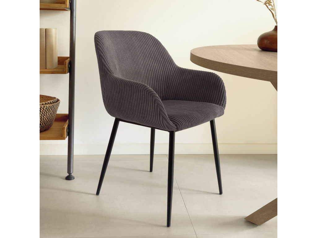 Manšestrová jídelní židle Kave Home Konna vás zaujme nadčasovým stylem i komfortem a pohodlím. Pevná podnož z černě lakované oceli působí spolu s čalouněním zajímavým dojmem. Sedák i opěrka s područkami jsou čalouněné příjemným manšestrem s nádechem retro stylu. Hodí se do moderních i klasických interiérů.