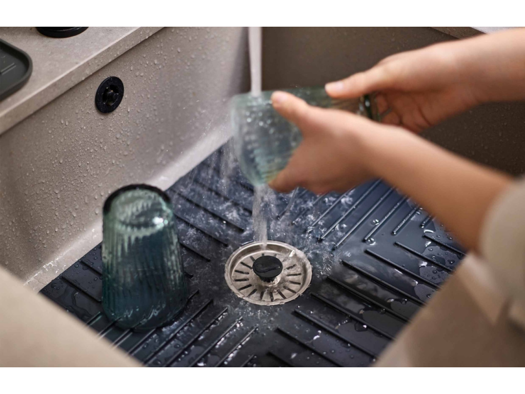 Chraňte svůj dřez i nádobí s promyšlenou podložkou Joseph Joseph SinkShield – elegantním a funkčním doplňkem, který tlumí nárazy, zabraňuje poškrábání a zároveň usnadňuje odtok vody. SinkShield je k dispozici ve dvou velikostech, takže perfektně padne do různě velkých dřezů. Její flexibilní tvar se snadno přizpůsobí, a protiskluzová úprava zajišťuje stabilitu i při větším mycím provozu. Praktický výřez navíc umožňuje snadný přístup k odtoku bez nutnosti podložku posouvat.