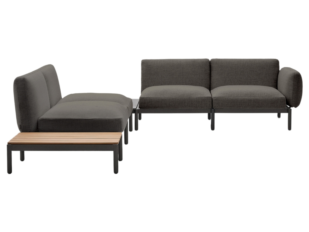 Doplňte svůj venkovní nábytek o modulární rohovou pohovku Sorells od Kave Home a vytvořte si na zahradě oázu klidu přesně podle svých představ. Maximální stabilitu poskytne lakovaná hliníková konstrukce v tmavě šedé barvě, která je odolná vůči korozi a povětrnostním vlivům. Konstrukce je doplněna čalouněnými sedáky s opěradlem, které zajistí vysoký komfort při posezení s přáteli i soukromém odpočinku. Čalounění je odolné vůči UV záření, proto se nemusíte obávat vyblednutí látky. Pohovka nabízí čtyři místa k sezení s pohodlnými odnímatelnými polštáři a dvě odkládací místa v podobě integrovaných stolků z teakového dřeva a šedě lakovaného hliníku. Dodejte své zahradě osobitost s kolekcí Sorells, která nabízí pomocí modulárních kombinací přizpůsobit si venkovní sezení podle vlastních potřeb.