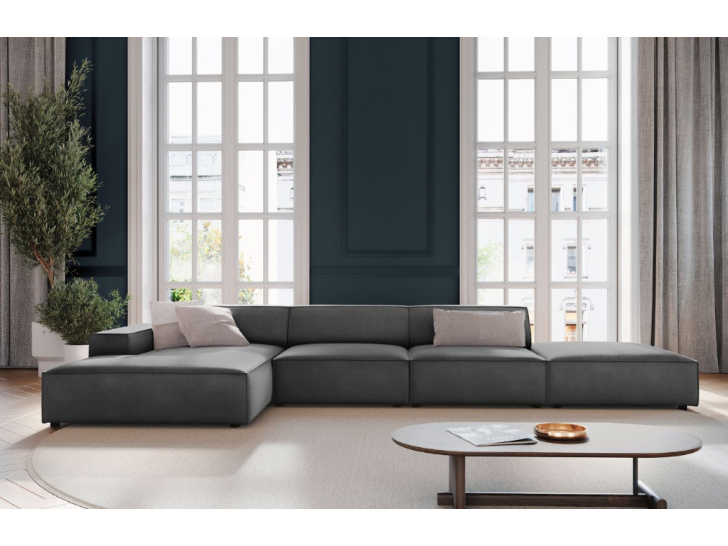 Prostorná modulární rohová pohovka Jodie od značky Micadoni zaujme svou krásnou siluetou. Čalounění je vyrobené z tkaniny, která imituje samet s jemným leskem. Látka se vyznačuje dobrou odolností proti oděru, což výrazně snižuje riziko jejího poškození, také prošla testem na cigarety, díky tomu je pohovka vhodná i do komerčních prostor. Její polstrovaný tvar vám zaručí plnohodnotný odpočinek, zatímco hluboký sedák umožní dokonalou relaxaci. Opřít se můžete také o tvarované opěráky a široké područky, které vybízejí k nespoutanému lenošení. Nízká podnož ladí s útulnou siluetou nábytku. Velký výběr modulů vám umožní vytvořit si kombinace, které budou nejlépe vyhovovat vašemu obývacímu pokoji v minimalistickém či skandinávském stylu.