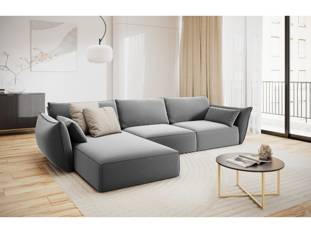 Čtyřmístná rohová pohovka Kaelle od značky Micadoni zaujme elegantním nízkým sezením a tvarovanými područkami, které jí dodávají jedinečný vzhled. Obdélníková silueta s propracovaným lemováním kolem područek a opěradel připomíná tvary polštářů, které poskytují pohodlí a činí pohovku ideálním doplňkem moderního obývacího pokoje. Součástí sezení jsou malé polštářky, které dodává styl i komfort. Celý povrch je čalouněn sametovou tkaninou, která působí čistě a luxusně. Tento model lze navíc snadno kombinovat s dalším nábytkem ze stejné kolekce, která je dostupná jak v žinylkovém, tak v sametovém provedení.