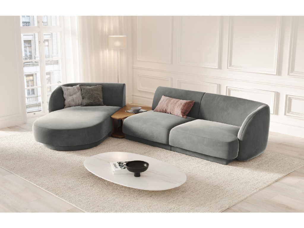 Trojmístnou rohovou pohovku Miley od značky Micadoni si zamilujete! Její elegantně obloukovité opěradlo vás doslova zve k odpočinku, zatímco jemně zapuštěná základna dodává celému kusu vzdušnost a lehkost. Měkký, odolný a na pohled příjemný samet poskytuje nábytku lákavý vzhled, který vnese do místnosti záři a pocit sofistikovanosti. Pohovka je ideální volbou do interiéru v moderním nebo skandinávském stylu. K pohovce je možné přikoupit další produkty z kolekce Miley. Díky tomu si můžete vytvořit sedací soupravu, kterou je vhodné kombinovat se skleněným nebo dřevěným konferenčním stolkem.