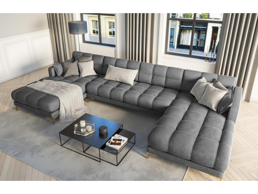 Elegantní šestimístná rohová pohovka MICADONI MAMAIA zaujme na první pohled svým nadýchaným vzhledem. Velmi příjemné sametové čalounění v šedé barvě a kovová podnož vytváří kontrast, který interiéru dodá elegantní vzhled a nádech luxusu. Díky zajímavému prošívání vzniká jemný design, který do vašeho domova vnese lehkost a styl. Opěrné polštářky zvednou úroveň vašeho odpočinku o stupeň výš. Díky praktickému tvaru do písmene U získáte rovnoměrně rozdělená místa k odpočinku. Nechte se obklopit komfortem ve společnosti produktů Mamaia.