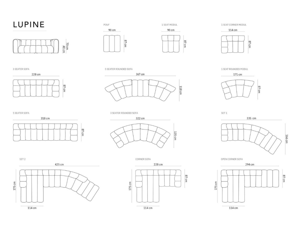 Trojmístná pohovka Lupine vyzařuje elegancí a vybízí k odpočinku, konverzaci a užívání si bezkonkurenčního pohodlí. Design sezení se vyznačuje futuristickým a zakřiveným tvarem, který je čalouněný sametovou látkou. Krásná a příjemná tkanina s decentním leskem vykazuje vysokou pevnost a odolnost proti opotřebení. Navíc obsahuje ochranou vrstvu, která zabraňuje pronikání kapalin do vnitřního materiálu sezení. Kolekce Lupine zahrnuje podnožky a několik variant pohovek, které jsou dostupné v různých barevných provedeních. Díky tomu si můžete vytvořit jedinečnou konfiguraci sezení, která se stane ústředním bodem vašeho obývacího pokoje nebo společenské místnosti.
