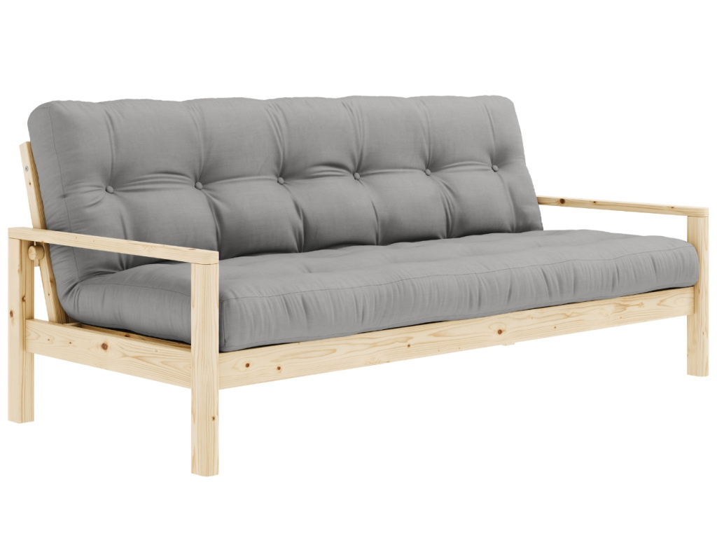 Pohovka nebo postel? Trojmístná rozkládací pohovka Knob od dánské značky Karup Design umí být obojím! Pod dřevěnými područkami se nachází dva nenápadné úchyty, které lze snadno odšroubovat a vy tak během chvilky získáte pohodlné lůžko pro vás nebo vaše hosty. Konstrukce z masivního borovicového dřeva s FSC certifikací je doplněna kvalitní 14cm futonovou matraci, která v sobě kombinuje recyklovaná vlákna a 4 cm pěny. Pohovka Knob fantasticky zapadne do skandinávských a japonských stylů interiérů, do kterých vnese jednoduchost, eleganci a ryzí funkčnost. Představuje skvělé řešení zejména pro menší prostory, do kterých přinese další místo na spaní. Vybrat si ji můžete v další barvě konstrukce či v mnoha barvách matrací.