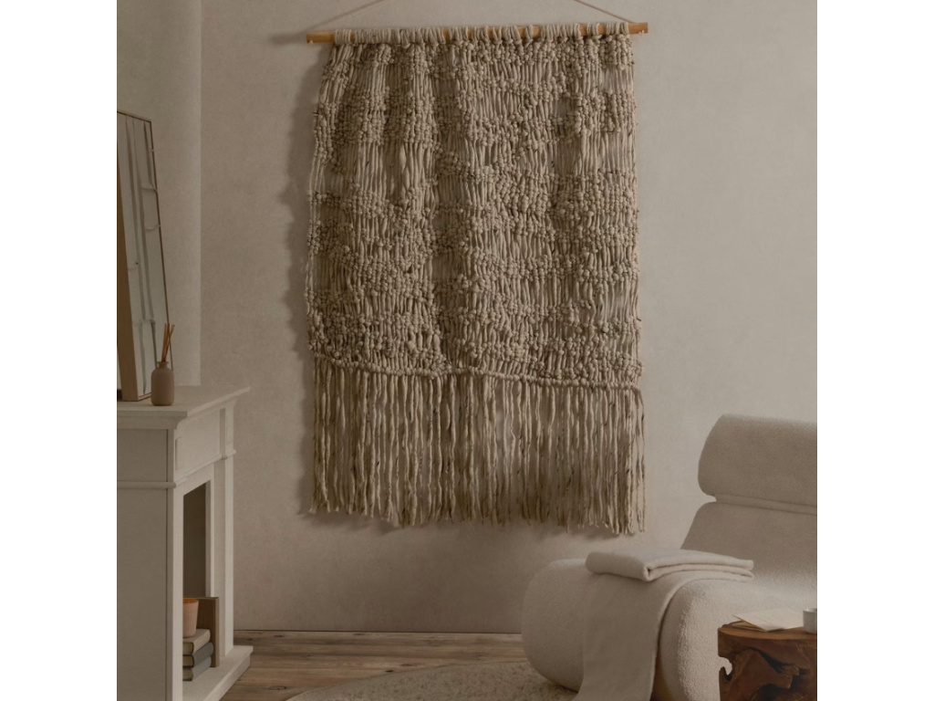 Nástěnná dekorace Kave Home Fley v podobě vlněné tapiserie je vyrobena technikou macramé. Skvěle se hodí do boho a rustikálních interiérů, které pomůže zútulnit a dodat jim na zajímavosti. Díky praktickému provázku ji na zeď snadno zavěsíte – vyjímat se bude například nad postelí.