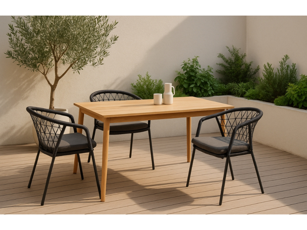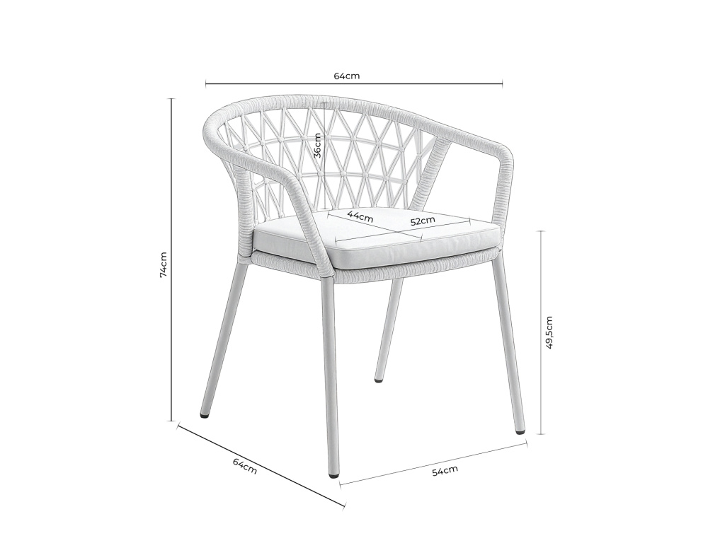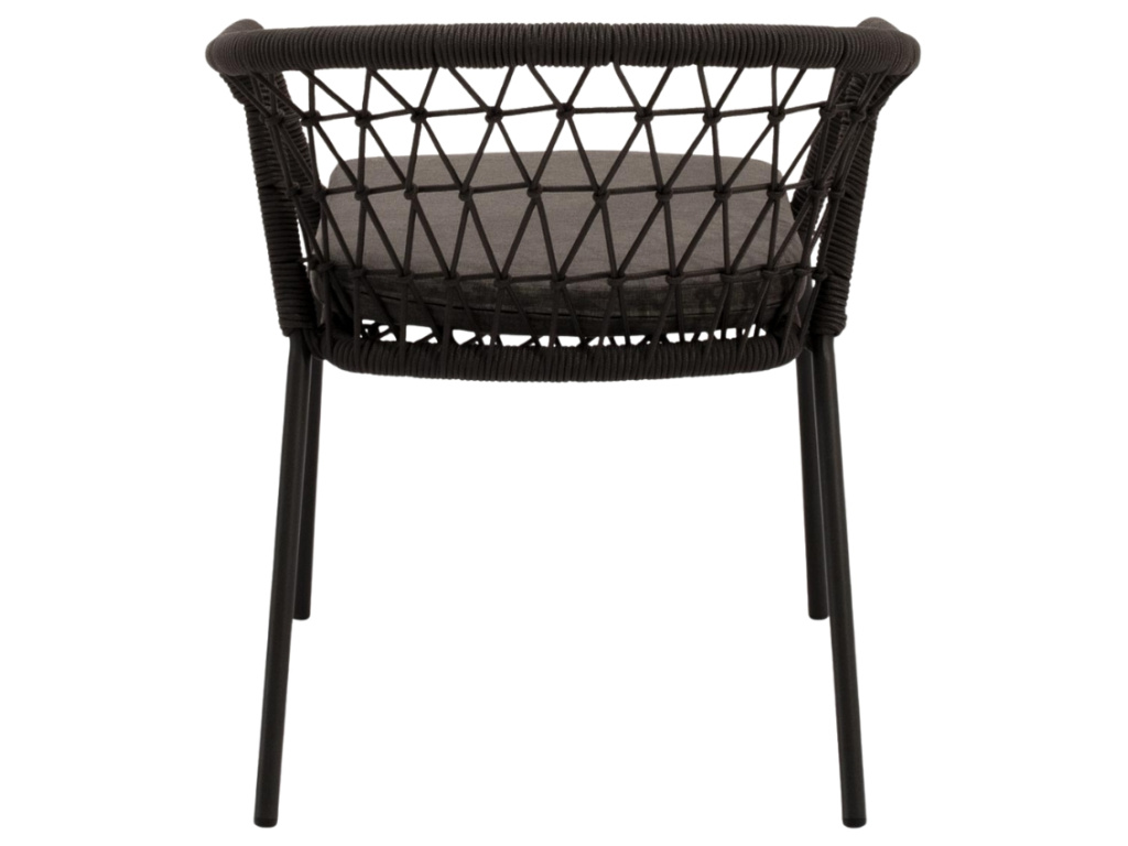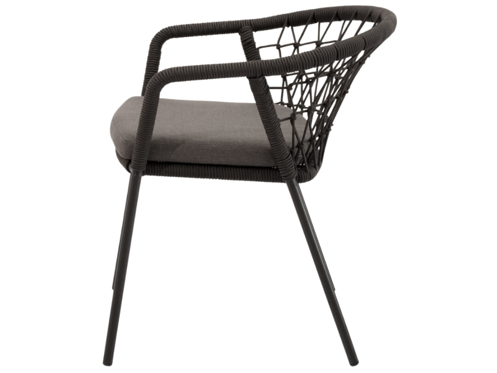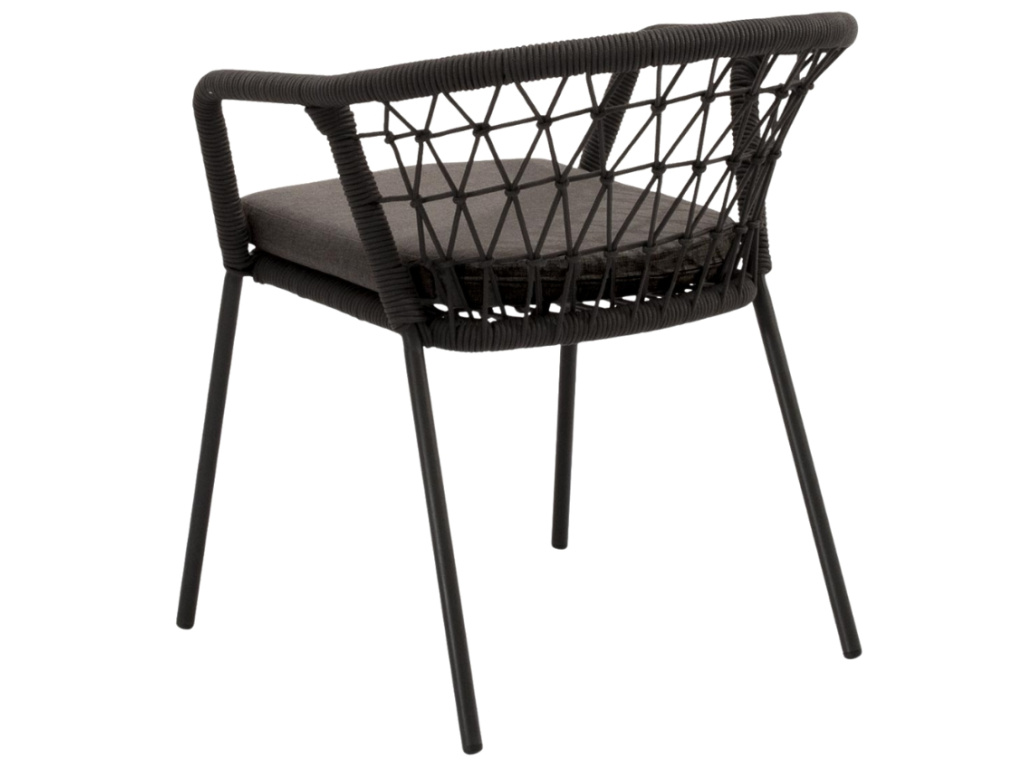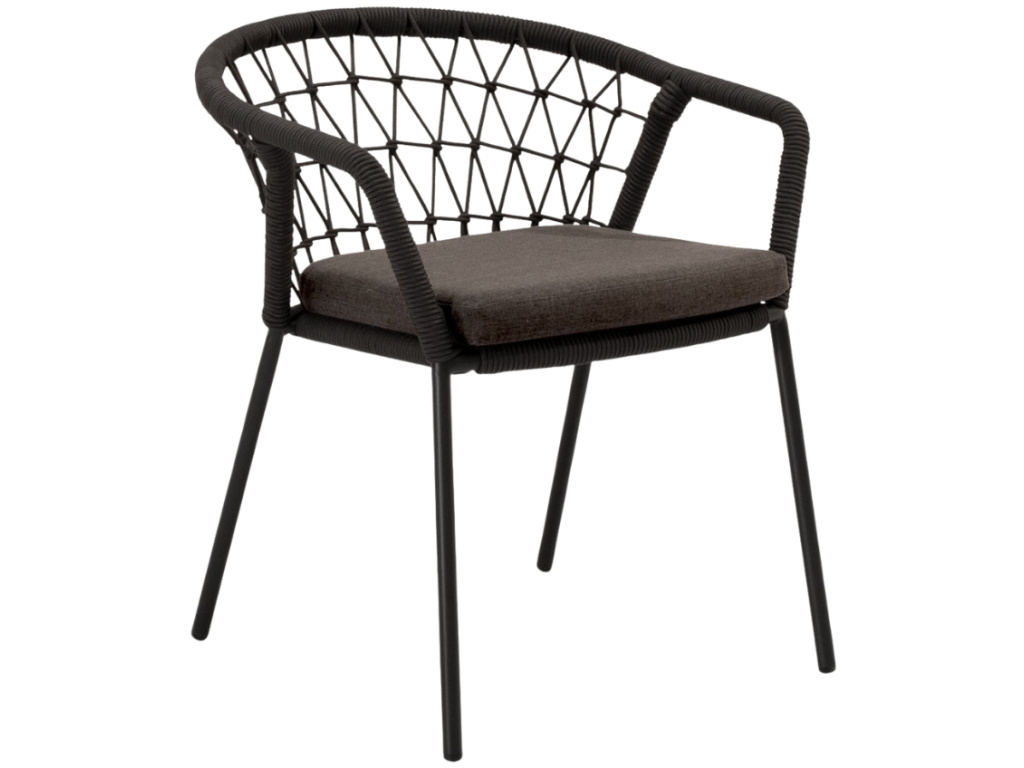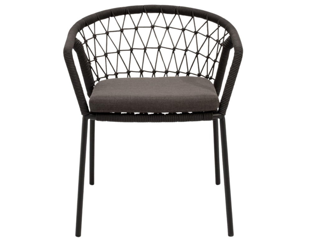 Zahradní židle Solene v sobě spojuje lehkost designu a praktické pohodlí, a stává se tak stylovým doplňkem každého venkovního posezení. Opěrka a područky jsou tvořeny pevným výpletem ze syntetického lana v antracitovém odstínu, který elegantně kopíruje tvar židle a zároveň poskytuje příjemnou, ergonomickou oporu. Jemně zkosená ocelová podnož dodávají stabilitu i na méně rovných površích, zatímco měkký sedák s odolným polyesterovým potahem v tmavě šedém odstínu zaručuje pohodlí i při delším sezení. Kolekce židlí Solene dokonale ladí s barovými židlemi Edwin a jsou ideální volbou pro terasy a zahrady v boho, středomořském i moderním stylu.