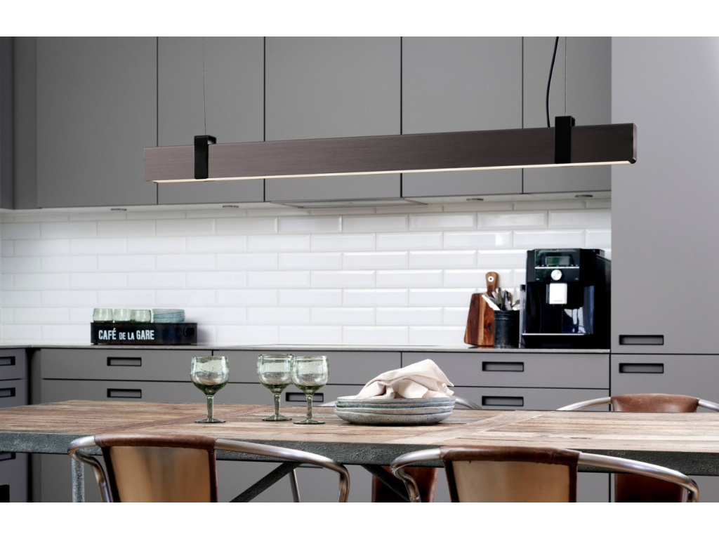 Světlo Lilt zaujme čistým industriálním designem s ostrými liniemi a minimalistickým provedením. Díky podlouhlému tvaru je ideální volbou nad dlouhý jídelní stůl, kde poskytne rovnoměrné osvětlení. Integrované LED žárovky umožňují nastavení intenzity světla pomocí třístupňového moodmakeru, takže si snadno přizpůsobíte osvětlení podle aktuální potřeby. Decentní kombinace tmavě šedé barvy a kovových prvků dodává prostoru moderní nádech. Světlo Lilt se stane stylovým a funkčním doplňkem jakéhokoliv interiéru. K dostání je ve dvou barevných variantách.